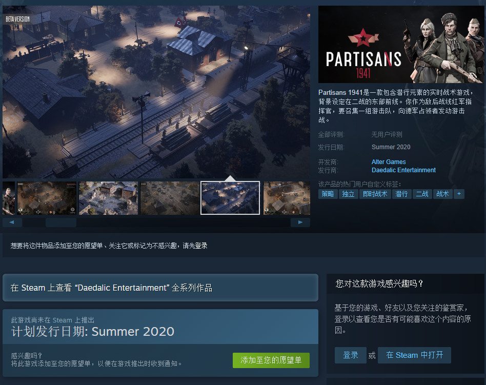 《游击队1941(Partisans 1941)》日前上架了Steam平台,根据Steam页面,本作将于今年夏季发售,支持简体中文。 《游击队1941》是一款包含潜行元素的实时战术游戏,背景设定在二战的东部前线。你作为敌后战线红军指挥官,要召集一组游击队,向德军占领者发动游击战。 预告片: 潜行战术类型的新玩法:《游击队1941》融合了潜行、行动、资源管理和基地建造元素。 在二战期间,掌管抵抗德国占领的一组苏联游击队。自主计划和发起战斗。利用战术停顿,研究环境,然后选择最佳位置发起伏击。 在树林深处秘密建造抵抗营地,然后寻找盟友与你并肩作战。组建多支独特的游击队,承担不同任务,削弱敌人火力和基础设施,同时获得迫切需要的资源来维持抵抗。 体验二战独特的戏剧性背景,成为敌后战线的红军指挥官。 特色 潜行战术类型的全新玩法。实时战术的新玩法,结合战斗、潜行、伏击和各种特殊物品,为敌人队伍制造骚乱。任意选择完成各项任务的方式。 带领一支游击队。自主组建和升级游击队。利用角色优势,寻找适合不同情况的解决方案。寻找并招募新的抵抗者。 体验抵抗组织的生活。在不同任务之间转换,见证游击队的日常生活,扩大基地,准备后续部署,确保拥有游击队生存所需的资源。保持部队积极性。探索附近地区,发起遭遇战寻找敌人弱点,然后伺机袭击敌人。 从不同角度了解二战。体验苏联奋勇抵抗德军在东部前线上残酷占领的故事。了解包括军队和普通民众在内的各类人群加入游击队的经历和动机。 背景和故事 你是逃离纳粹集中营的红军指挥官阿列克谢·佐林。召集敌后战线遗留士兵和本地居民,组成一支游击队。和队员并肩作战,执行小型破坏任务,直至攻击占领军。在红军参谋部发起,区域全体游击队执行的行动中发挥主导作用:袭击德军前线的补给线,为列宁格勒保卫者争取更多时间来准备抵抗德军的进攻。 |