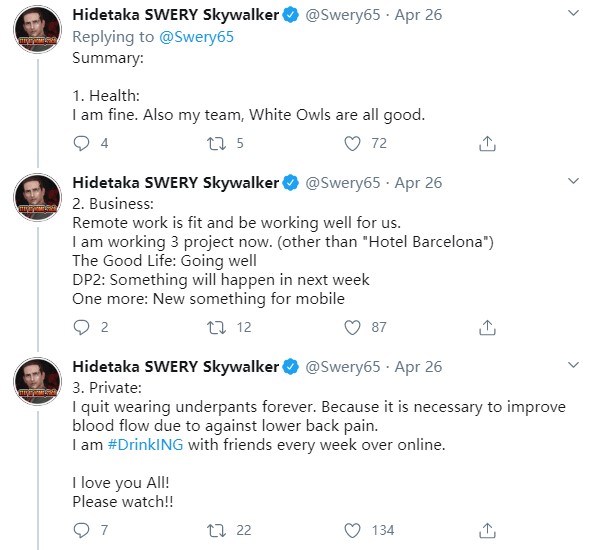 自2019年9月任天堂直面会正式公开《致命预感》系列新作《致命预感 2》后,便鲜有消息出现在玩家们的视野之中。近日,游戏制作人 Swery65 在个人 Twitter 上总结了他在接受 IGN 日本采访时所讲道的内容,目前 Swery65 正在同时制作三款游戏,广受期待的《致命预感 2》也将于下周公布新消息。 首先 Swery65 表示制作团队目前的健康状况良好,各位粉丝不用担心;第二在业务方面,远程办公的模式非常适合制作团队,目前 Swery65 正在同时制作三款游戏(除了《巴塞罗那旅馆》之外),其中《The Good Life》的开放状况良好,《致命预感 2》将于下周公开新消息,另外还有一款未公开的移动端游戏正在开发中。 《致命预感 2》预告片: 《致命预感》初代是一款开放世界角色扮演游戏,玩家扮演特种探员 Francis York Morgan 调差凶杀案,该探员拥有从从咖啡杯得到超自然信息,带玩家进入怪物横行的地狱位面的特殊能力。《致命预感 2》预计将于2020年内推出。有意思的是,Swery65 还提到了一些私人的内容,“我再也不会穿内裤了,这有助于改善背部的血液循环”,看来 Swery65 也深受背部疾病的困扰… |