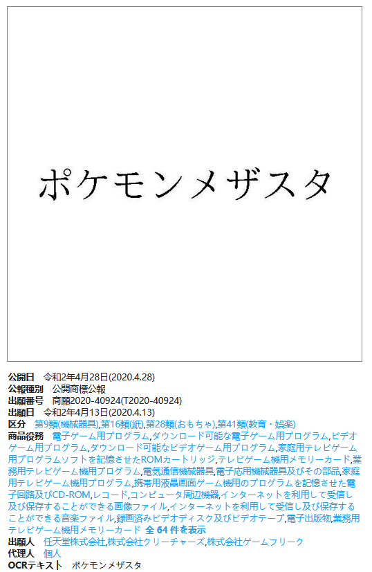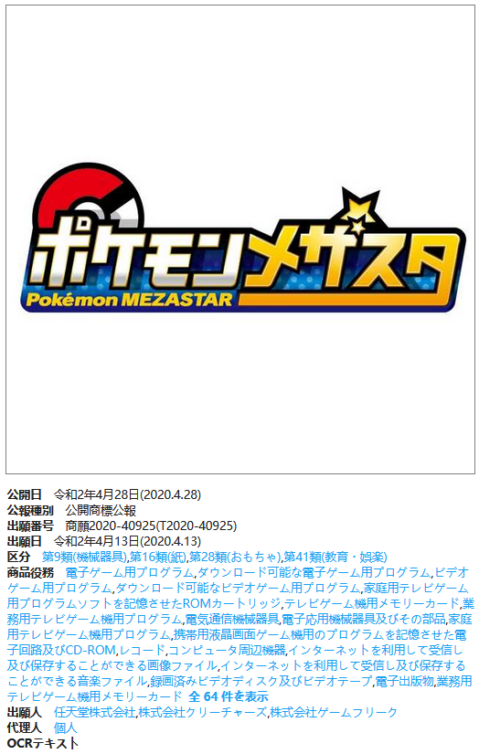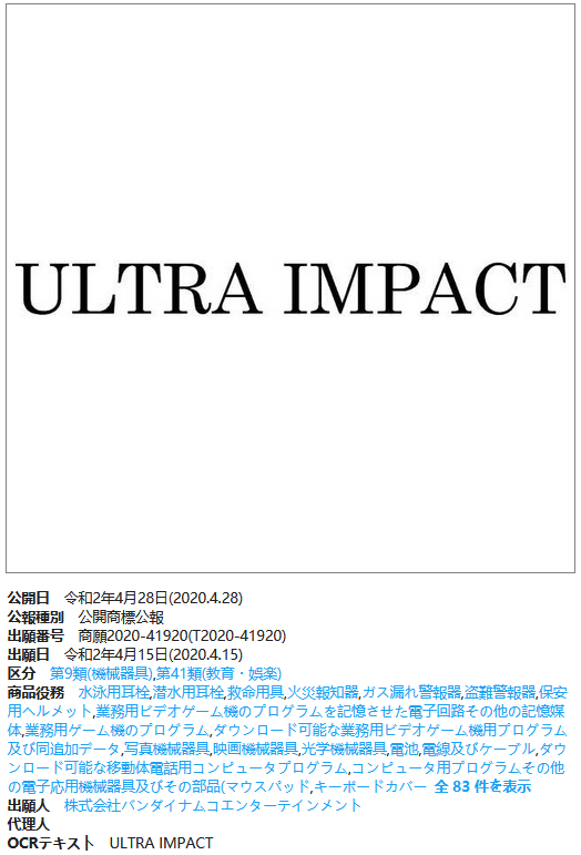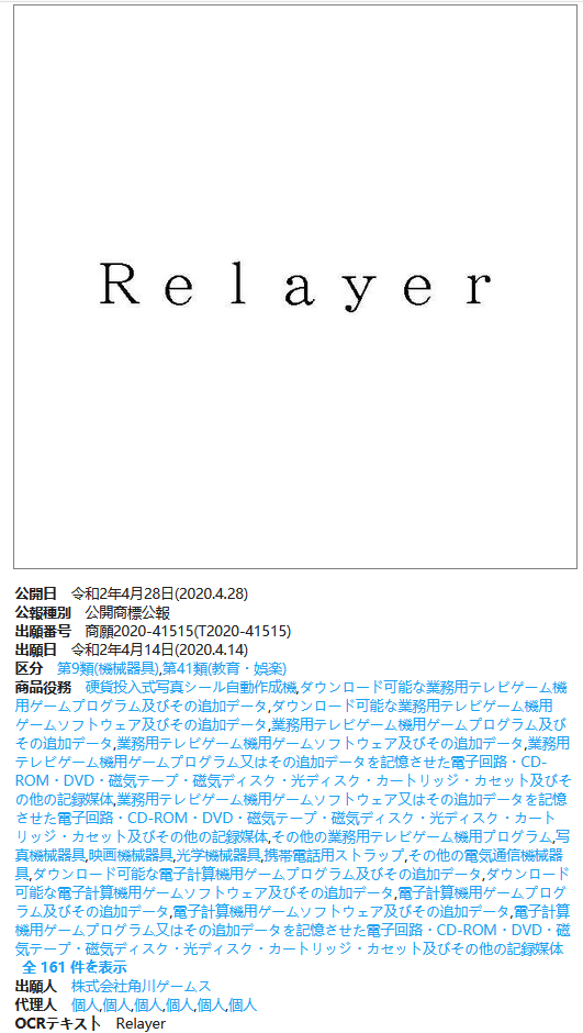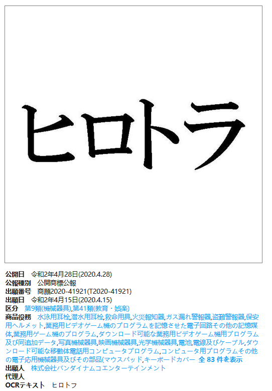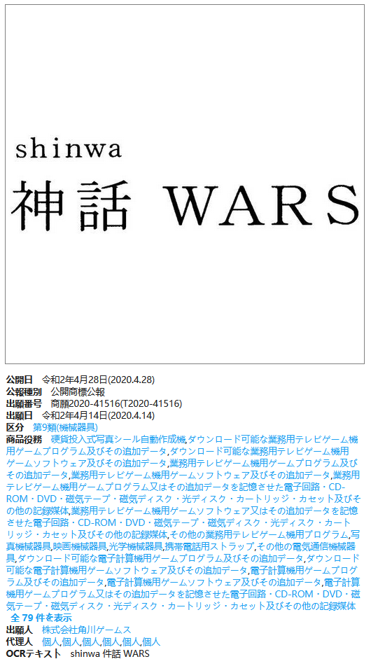 根据外媒gametsu的最新报道,万代南梦宫、任天堂以及《舰队Collection》开发商Kadokawa Games近日在日本注册了一些新商标,以下为此次公开的具体细节。 Kadokawa Games商标“Relayer”和“神话Wars” : 万代南梦宫新商标“ヒロトフ”和“ULTRA IMPACT”: 任天堂新商标“Pokemon Mezastar” |