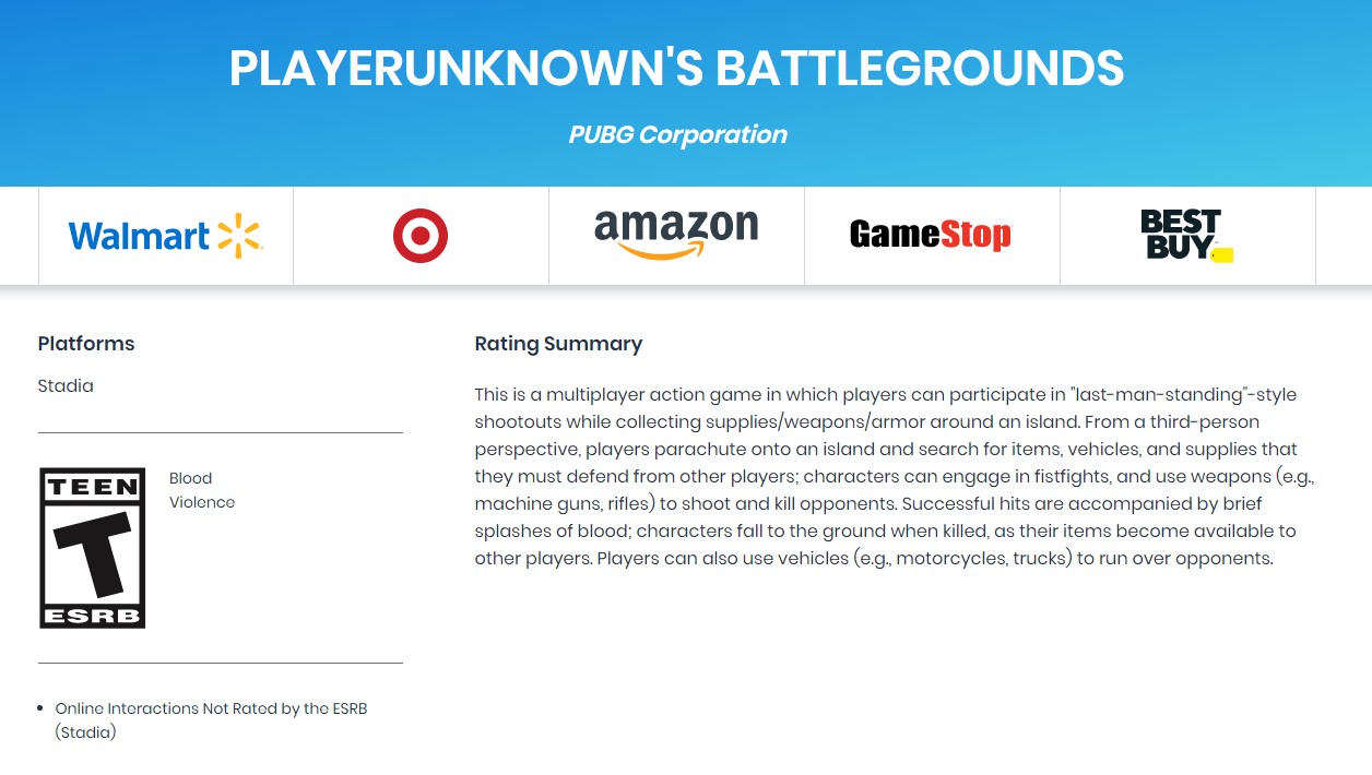 《八方旅人》《绝地求生》Stadia版评级均为T级13+
