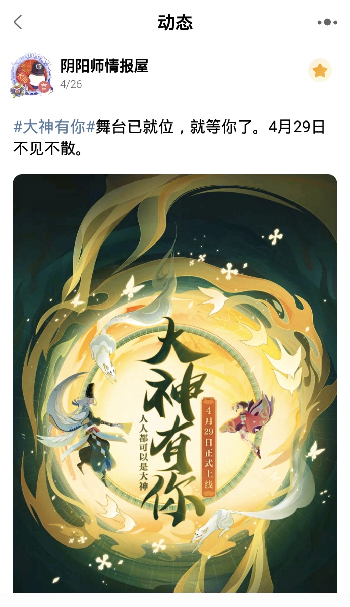 你是否空有一身本领无处施展?你是否想成为《阴阳师》中家喻户晓的大明星?机会来了!4月29日,由网易大神主办的阴阳师达人选秀企划《大神有你》正式启动,不管你是攻略高手、同人大触还是搞笑达人,都可登陆网易大神app进入《阴阳师》游戏圈报名参赛!不仅可以赢取千元现金、游戏道具大礼包,还有机会入驻名人堂、获得官方签约机会!在这里,人人都可以是大神,赶紧来参与吧! 【网易大神《阴阳师》游戏圈全新企划,《大神有你》等你来秀!】 早在4月26日,长期在大神中为玩家提供一手资讯的@阴阳师情报屋就放出消息:“舞台已就位,就等你了。4月29日不见不散。”首次出现的#大神有你#话题和预告海报可谓悬念十足,玩家纷纷猜测到底是什么活动?有什么奖励? 4月29日,活动终在网易大神《阴阳师》游戏圈揭晓悬念,正式开启阴阳师达人秀企划——《大神有你》!玩家只需在网易大神APP内带话题 #大神有你# 发布视频展示你的才艺,即可成功参与活动。投稿截止时间为5月12日23:59,想要参与的朋友千万不要错过了哦! 活动详情,可见活动话题页:https://m.ds.163.com/topic/%E5%A4%A7%E7%A5%9E%E6%9C%89%E4%BD%A0 【变身达人C位出道,海量福利等你来拿!】 本次特别企划将历时一个月,从投稿到入围、导师评审、人气投票,最终票选9人成团出道! 其中入围作品作者将获得入围礼包(御行达摩碎片*6、勾玉*666、金币*66666、体力*666),还可以享受导师直播点评和官方MCN签约的机会;而最终出道的9名作者,不仅可以将御行达摩*9等游戏道具带回家,还可以获得千元现金、获得入驻游戏名人堂资格、大神开屏广告1天、大神达人认证、官方MCN签约和官方合作等五大特权。 没有才艺的玩家朋友也不用担心,投票阶段选出你支持的作品,所有参与投票的玩家都可以获得大吉达摩和金币奖励,更有机会获得神秘符咒*1。 【达人导师为你排忧解难,人人都可以是大神!】 除了新颖的成团形式和海量福利,官方还邀请了四位达人担任导师,为广大玩家排忧解难。如果你暂时没有创作灵感,不妨来看看他们为你出的考题: 《大神有你》等你来秀,赶紧来网易大神《阴阳师》游戏圈投稿吧!期待你的作品~ 【关于“网易大神”】 网易大神是网易游戏旗下的精英玩家社区。这里汇聚了广大精英玩家、游戏圈红人、行业大咖,集合了网易独家的官方资讯和福利趣闻,旨在为玩家打造一个丰富的游戏兴趣社交圈。玩家可以在网易大神与游戏中的好友实时聊天、多元互动;以游戏会友,结交更多游戏同好,和大神一起发现更多游戏乐趣。 |