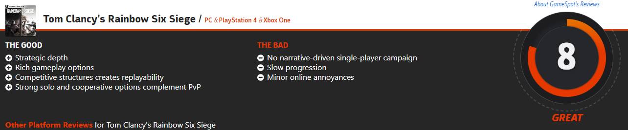 近日外媒GameSpot重评了育碧2015年发售的服务型游戏《彩虹六号:围攻》,给出了10分大满贯好评。本作2015年首发时,GameSpot打出了8分。实际上这并不是外媒第一次为服务型游戏重新评分,早在之前IGN就为更新多年的《星球大战:前线2》重新评分,由首发时的6.5分提到了8.8分。 GameSpot认为在发售超过4年多之后,2020版的《彩虹六号:围攻》已经进化到了不光是一个令人痴迷的射击游戏,而且还是这个游戏类型的最佳范例。 优点: +丰富的战术深度,带来了各种进攻和防守策略 +每一局比赛都感觉是一次进步的机会,这一过程感觉很踏实 +每个干员都有其独特的玩法风格 +地图设计极其优秀,奖励那些对地图布局烂熟于心的玩家 +超绝的射击机制让枪械感觉很致命 +育碧不断地为本作带来了聪明的改动,改进了这款游戏 缺点: -除了每年的干员通行证之外还有季票,让人感觉很过分 以下是GameSpot 2015年给出的评价,可以对比看看本作取得的进步: 优点: +战术深度 +丰富的游戏玩法 +竞技性结构带来了重玩性 +强大的单人和合作模式弥补了PvP 缺点: -没有单人剧情战役 -升级较慢 -在线小问题 |