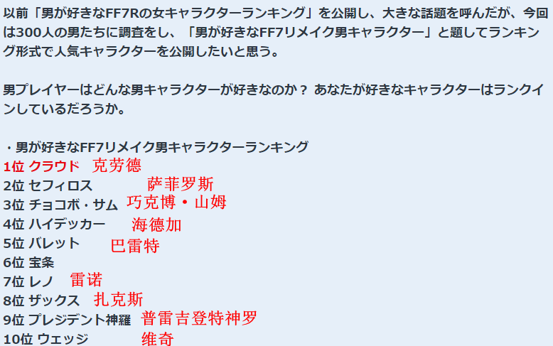 日媒发布男性喜爱的《FF7重制版》男性角色排行