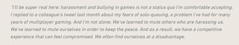 在最新的开发者日志中,拳头《Valorant》团队再次谈到了游戏中的骚扰问题,毕竟类似的问题在各大多人联网游戏中频发,开发团队表示对其非常重视。 执行制作人兼《Valorant》开发团队负责人的Anna Donlon表示:“我先把话说清楚,游戏中的性骚扰和欺凌现状是不可接受的。在上个月我给同事推特的回复中我也说了自己多年来害怕单排,因为骚扰是一直存在的问题。我们学会静音那些骚扰我们的人,也学会了冷处理保持沉默,但结果是这样子的游戏体验并不友好,我们依旧常常处于不利地位。” 在镇压骚扰的问题方面拳头一直拿玩家没什么办法,发家游戏《英雄联盟》内的游戏环境大家都懂(不论什么服)。过去拳头也因为职业选手在比赛中的不雅行径而发出过禁令。甚至拳头公司自身都在前两年深陷员工骚扰风波,被一票前员工起诉。 因此,拳头公司在《Valorant》上似乎打算真正直面这个问题。Anna称开发团队已经特意成立了专门的“玩家动向”研究小队,来促进更好游戏环境的演变。为了完成这项艰巨的工作,拳头还希望能够尽快发布具有约束力的玩家行为准则,开发者们为以此为基础建立玩家社区的条条规规。 《Valorant》依旧处于内测阶段,预计夏季正式推出。 |
