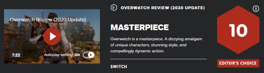 为了纪念《守望先锋》四周年和初代最后一位英雄的推出,IGN日前更新了《守望先锋》评测部分,并将评分上调至10分。 IGN表示: 在经历了四年时间和一届IGN年度游戏奖之后,《守望先锋》已进化成一直保持着一流水准的多人射击游戏。这款游戏包括令人目不暇接的、独特的人物设计,令人惊叹的实现风格,和令人信服的动态动作。在这款游戏中,你会觉得时间流逝的很快,并痴迷于每一轮令人兴奋的战斗,还能享受充满细节和精致手工打造的地图内容。简而言之,《守望先锋》是我玩过的游戏中最有趣的。 总评: 《守望先锋》是一款独一无二的英雄射击游戏,绝对是同类游戏中最好的。它提供的多样性、深度和风格很少能有对手与之匹敌。其推出四年所带来的的积淀成就了无与伦比的多人游戏体验。无论是备受玩家喜爱,充满话题的角色,还是业界老将制作的地图,抑或是出色的音效设计和动态动作,都表明这是一款极具竞争力的竞技操作杰作。但最重要的是,这么多年来,它一直都很有趣。所有这些因素结合起来,使《守望先锋》成为一款非常特别的射击游戏,我毫不犹豫地向所有人推荐这款游戏。 评分:10,编辑之选 《守望先锋》是一部杰作,是一款集令人目不暇接、独特的人物设计,令人惊叹的游戏风格,和令人信服的动态动作大成之作。 以下是之前2016年IGN给《守望先锋》的评分: |