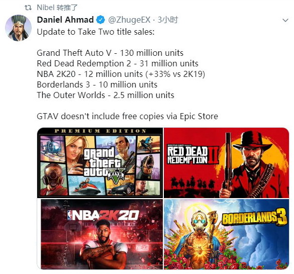 今日(5月21日)Take Two互动在在2020财年Q4财报会议上,公布了《荒野大镖客2》《侠盗猎车5》等游戏的销量。业界资深分析师Daniel Ahmad在推特上放出了Take Two的新销量数据,一起来看看吧! 《荒野大镖客2》的销量达到3100万份,而宝刀不老的《侠盗猎车5》的销量达到了1.3亿份(注意:不包含Epic商城免费赠送的那部分)。而在三个月前,《荒野大镖客2》和《侠盗猎车5》的销量分别为2900万份和1.2亿份。 《侠盗猎车》系列的累积销量达到3.25亿份,其中《侠盗猎车5》就占了40%。《NBA 2K20》的销量达到1200万份,《无主之地3》的销量为1000万份,《天外世界》的销量为250万份。 |