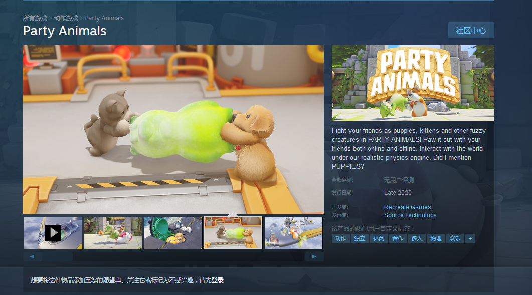 根据Steam商城公开的新消息,一款名为《Party Animals》(暂译为《动物派对》)的萌系多人对战游戏目前已经上架Steam商城页面,该游戏将于2020年晚些时候正式上市,以下为哦官方公开的游戏介绍内容。 Steam商城页面截图: 《Party Animals》(暂译为《动物派对》)是一款萌系多人对战新游,玩家可以和小伙伴们一起在游戏中扮演超萌的阿猫阿狗或者是其他小动物,互相打闹。这款游戏采用了具有真实感的物理引擎,想必会为打闹提供不少欢乐。 萌系对战新游《动物派对》目前已经上架Steam商城页面,暂不支持中文,感兴趣的玩家可以点击此处将游戏加入愿望单。 游戏截图: |