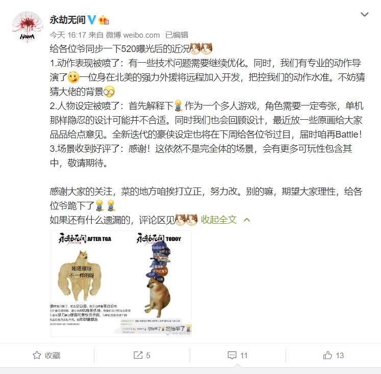 《永劫无间》官微又耐不住寂寞了,继公然济私追星乌合麒麟,调戏敌厂WeGame之后,终于拿自己开刀了。蹭着最近DOGE表情包的第二春,发图调侃自己如何面对“抄袭”风波。 在初登TGA时,还曾据理力争,尝试沟通飞索与拼刀的玩法逻辑,也曾解释作为核心系统,飞索和拼刀在《只狼》上市前就已完成。甚至还觉得要说抄,不如说是抄守望先锋。 但经历520新宣传片一役,官博已经看淡了生死,一句您抬举了,啥帽子都默默接下。 官微同时也透露,除了这些风波,诸如动作与角色设计,的确是有“菜”的地方,但都在踏实改正。一名来自著名项目的核心动作导演将加入团队;更多角色设定也将逐步放出,与玩家们Battle。 如果想参与讨论,直接影响这款作品,就马上关注微博吧! 《永劫无间》现已在steam平台开启预约,想了解更多游戏相关,跟官方深入交流,或围观官博弟弟在线挨打。 |