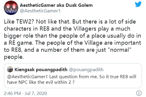 近日有网友向曾多次准确泄露了《生化危机》消息的推主Dusk Golem问到《生化8》是否会有像是《恶灵附身2》那样的NPC。Golem回复说《生化8》并不是那样,但会有更多的配角。 他说:“像《恶灵附身2》那样?并不是。不过RE8中会有大量的配角,而且村庄中的人,他们的戏份要比之前《生化危机》游戏中一个地方的人更加重要。村庄里的人在生化8中非常重要,他们中有很多人只是【普通人】”。 值得一提的是,《生化危机7》也有一些正常角色,比如Zeo和Lucas Baker。玩家可以期待《生化危机8》将如何在此基础上得以扩展。也许玩家可以通过他们的行为影响不同村民的命运? 《生化危机8》将于2021年发售,登陆PC,PS5和XSX。 |