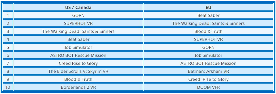 《GORN》和《Beat Saber》分别在美国/加拿大和欧洲PSVR下载榜排名第一。