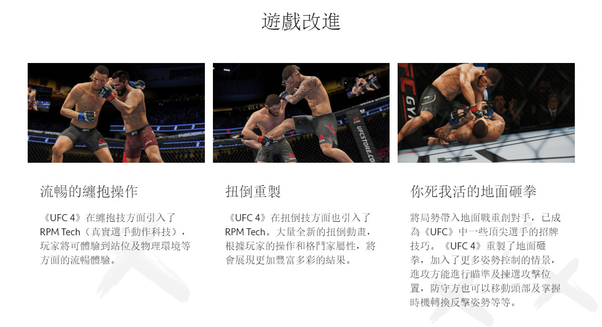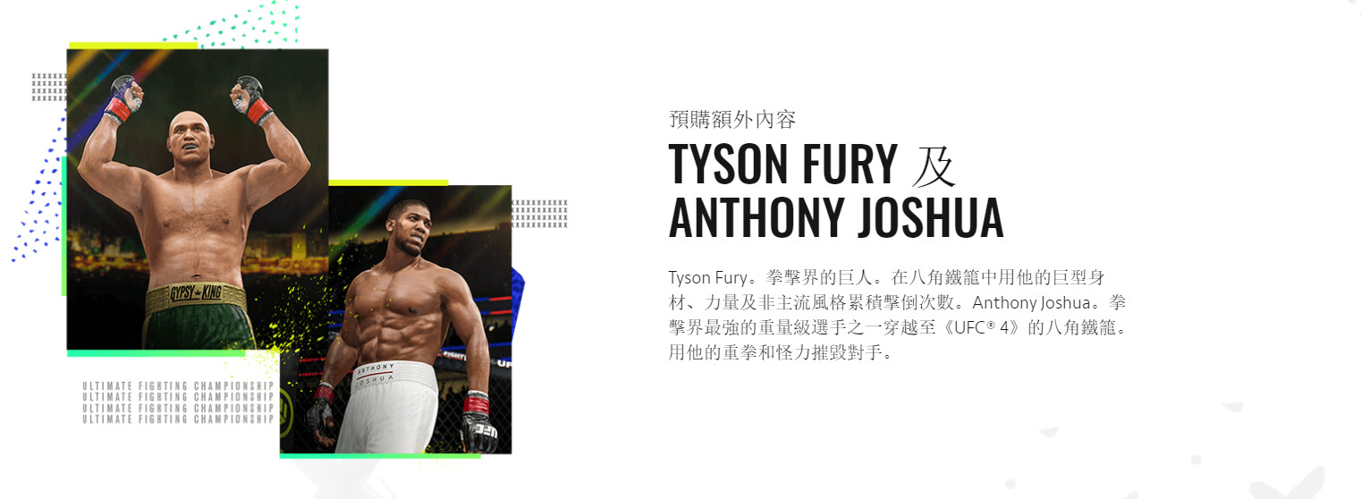 EA正式公布了《EA Sports UFC 4》,将于8月14日发售,登陆PS4和Xbox One。尽管EA没有公布PS5和XSX版,但ESRB分级提到了次世代主机版本。 中文版预告片: 目前《UFC 4》已经上架PS港服商城,标准版469港币(EA Access用户422港币)。 预购福利: - 泰森福里 - 安东尼约书亚 - 后院定制包 - 印刷牛仔短裤 - 后院迷彩衬衫 - 后院 MMA 手套 - 骷髅帽 - 黄金锁链 - 对打定制包 - 对打角斗士短裤 - 对打眼镜蛇球衣 - 绳索手套 - 眼镜蛇面具 - 对打项链 在《EA SPORTS UFC 4》中,您的战斗风格、成就和个性塑造了你的斗士。无论您是如何游玩或是在哪游玩,《EA SPORTS UFC 4》都将「您」成为战斗的中心人物。 |