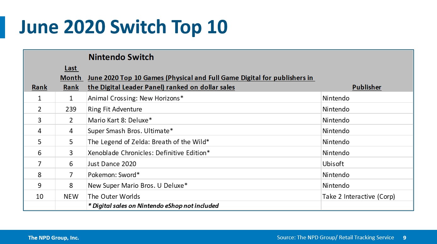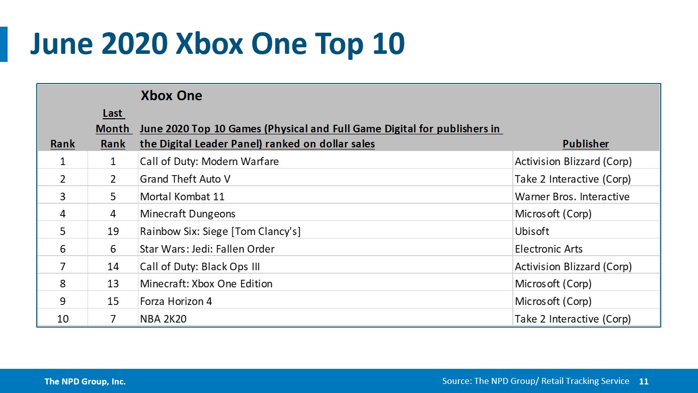 数据研究机构 NPD 公开了美国6月游戏销量榜,顽皮狗新作《最后的生还者 2》不仅成功登顶,而且本作的成绩可以排到今年发行游戏总销量的第三名,同时本作的首月销售额也问鼎了今年发行游戏的头位。其他游戏,《使命召唤:现代战争》与《集合啦!动物森友会》分居其后,补货成功的《健身环大冒险》也从上月的835名再次回到第7,《P4G》Steam 版的发售也让本作的销量从615名上升至第18。 此外,美国6月的游戏软件销售额较上月上涨了49%至5.7亿美元,这个数字也是自2010年6月的5.98亿美元以来的6月份最高水平。硬件方面,美国6月的硬件销售额同比下降17%至1.91亿美元,不过今年至6月的总销售额较去年同期增长了25%,达到16亿美元;Switch 也再次成为最畅销的游戏机,并且至今仍保持着最高的排名。 PS4 6月销量 Top 10: Switch 6月销量 Top 10: Xbox 6月销量 Top 10: |