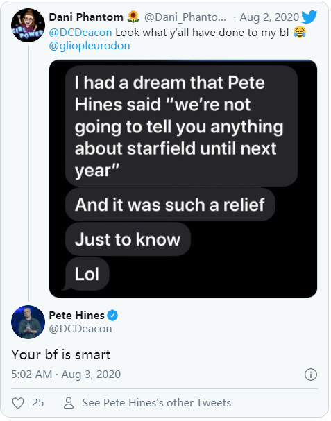 E3 2018上,B社公布了新的IP《星空》,这是一款单人科幻太空主题的FPS游戏。然而和去年一样,B社也不会公布这款作品的任何新细节。 B社的副总裁Pete Hines在Twitter上确认了这一点。如下图,有玩家发推说:“看看你们对我的男友做了什么”,并附上了一个图,上面是他男友的话:“我做了一个梦,梦里Pete Hines说[我们不打算告诉你们关于《星空》的任何事情直到明年。这真是一个解脱。我就是知道哈哈]”对此,Hines回复说:“你的男朋友很聪明”。 根据我们目前掌握的情况,《星空》将使用升级版Creation引擎开发,支持次世代主机平台。 此外,Hines还在Twitter上回复网友称他们对于《上古6》没有任何消息可说,而且在很长时间内都是如此。 |