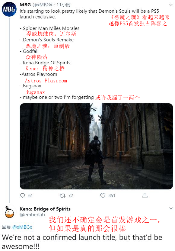 因为《恶魔之魂:重制版》已经在韩国通过评级,不少玩家根据以往的例子猜测,该作可能会是PS5的首发独占游戏。推特网友 xMBGx 就罗列了他认为的PS5首发游戏阵容(已公开),其中包括了《Kena:精神之桥》。 而《Kena:精神之桥》的官方推特也对此进行了回复,表示现在他们并不确认会是PS5的首发游戏: 在之后的回复中,《Kena:精神之桥》官推表示,他们目前还在为完成这款游戏而工作,现在无法确定游戏的发售时间,是因为他们不想把一个半成品交到玩家的手中。 在此前的官方公告中,《Kena:精神之桥》计划于2020年假期发售,登陆PS4/PS5和 PC(Epic)平台。不过从此次官方的表态中可以看出,如果开发进度不如预期,他们或许会延期游戏的发售。 |