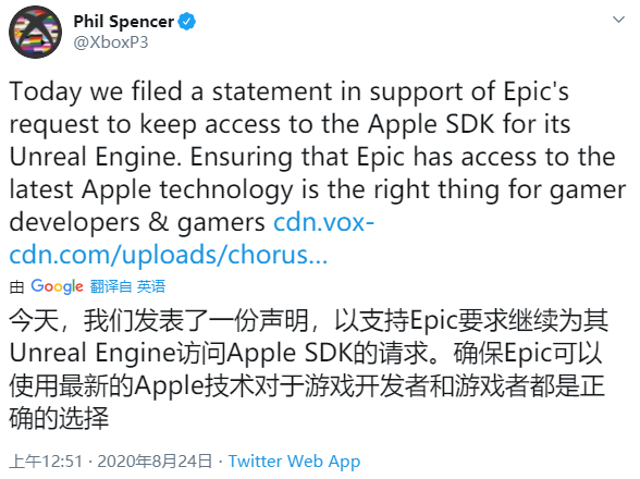 近期讨论度极高的苹果与Epic大战,双方针对“苹果税”平台分成之争,很可能会让后续iOS和Mac设备不再支持虚幻引擎,今天微软Xbox游戏部门负责人Phil Spencer发声,表示支持Epic。 为了支持Epic,微软以官方身份发表了一篇声明,由微软游戏开发体验部总经理Kevin Gammill亲自撰写。文中提到如果苹果不再向APP Store开发者提供虚幻引擎支持,那么微软将不得不从放弃iOS/Mac平台客户和更换新的引擎中做出选择。 声明中还提到了不让Epic使用苹果SDK会让那些已经、正在或可能未苹果开发游戏的开发者处于严重劣势。并且还举例为不同平台使用不同引擎开发游戏所造成的困难和成本劣势,由于iOS是一个巨大的平台,苹果停止支持虚幻引擎将对微软和其它开发商在今后选择引擎时造成重大影响。 前几年,Epic创始人Tim Sweeney曾公开表达对微软UWP的不满,并号召游戏业其它同行一起抵制UWP。目前,苹果已经下架了Epic的热门游戏《堡垒之夜》,iOS平台玩家无法和其它平台用户一样游玩到最新版本。 |
