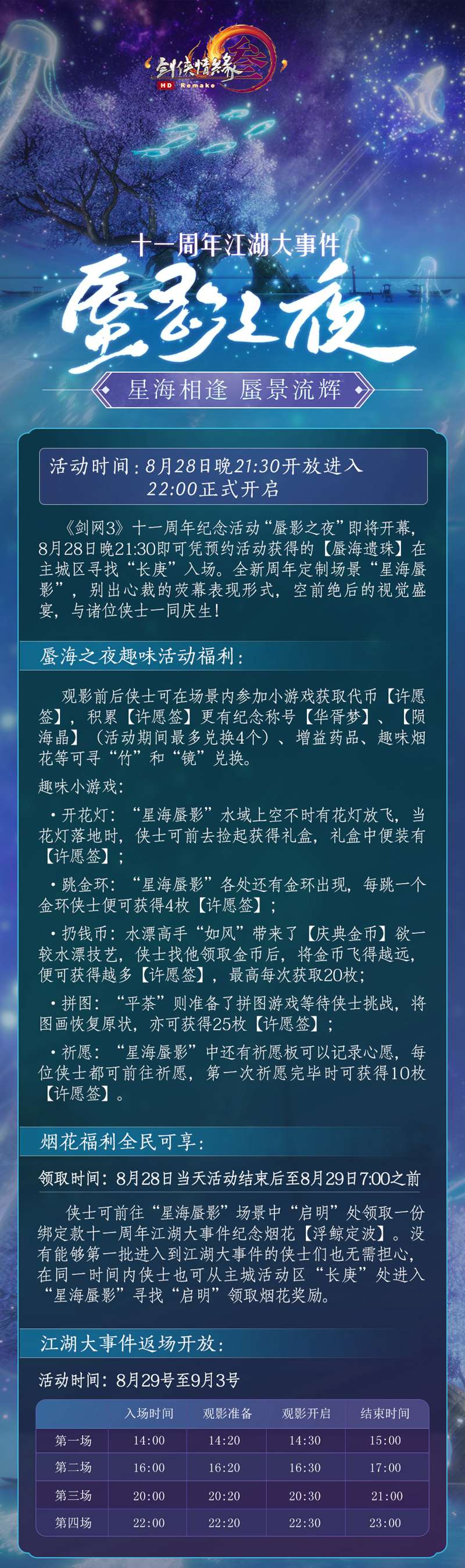 乘梦万里,山海相逢!《剑网3》十一周年线上直播发布会盛典今晚19:00不见不散!海量惊喜爆料令人期待不已,配合AR黑科技助力沉浸式剧场直播效果震撼加倍!更加令人惊喜的是,《剑网3》十一周年专题活动页预约分享奖励——828惊喜好礼【乘梦礼盒】今日12点开放领取,不仅可百分百获得【遗失的美好】,更有机会掉落十一周年专属挂件【山海乘梦】哦!预约奖励将于9月1日0:00截止领取,还请侠士们不要错过! 今晚19:00前往观看《剑网3》十一周年线上AR直播发布会盛典:直播地址 斗鱼:房间号:641986,地址:https://www.douyu.com/641986 虎牙:房间号:10109390,地址:https://www.huya.com/wuxia B站:房间号:828,地址:https://live.bilibili.com/828 前往《剑网3》十一周年庆专题活动页面领取奖励: 活动页面:https://jx3.xoyo.com/zt/2020/08/20/eleven/index.html?utm_source=meiti 侠士们期待已久的十一周年纪念大片《山海相逢》完整版正片今日公布!乘梦而行,一路纵有坎坷,却不敌心中侠者信念!扶摇而起,君行万里,跨越山海,只为与你相逢!且让我们随着这一曲《山海相逢》,一同回顾十一载江湖风雨,无法忘却的回忆与感动! 《剑网3》十一周年纪念大片《山海相逢》完整版正片: 而为了与侠士共同分享十一周年的喜庆,各大主城的“佟仁娘”处均新增《剑网3》十一周年纪念歌曲《山海相逢(器乐版)》以供侠士点播欣赏! 【新门派即将公布 十一周年发布会海量爆料抢先看】 十一周年线上直播发布会盛典今晚19:00正式拉开帷幕!本次发布会特采用全新AR直播黑科技,相信定能为侠士们带来耳目一新的震撼体验!同时还有海量惊喜爆料即将揭晓,备受瞩目的全新门派今晚就要揭开其神秘的面纱,借由沉浸式直播将带来炫酷的视觉盛宴!此外,江湖烽烟再起,各方势力暗流涌动,似乎又将有一场浩劫,而在此背后又有什么阴谋?更有《剑网3》大IP泛娱乐企划纷至沓来,超多内容令人目不暇接!《剑网3》职业联赛2020赛季即将起航,而侠士们期待已久的第三张音乐专辑也将闪亮登场,全新舞台剧《剑网3·双星记》也会带来诸多爆料,还有新一季《剑网3·侠肝义胆沈剑心》全新PV震撼首曝,更有全新影视企划带来更多惊喜!超多精彩内容不容错过,尽在今晚十一周年线上直播发布会盛典! 【江湖大事件今晚开启 全民共庆生辰】 当然还请侠士们不要忘记,在今晚十一周年线上直播发布会盛典结束后,《剑网3》端游内还将开启十一周年江湖大事件活动“蜃影之夜”!参与活动无需任何门槛,8月28日(即今晚)21:20之前,前往主城活动区寻找NPC“长庚”进行预约即可领取专属道具【蜃海遗珠】,凭借此物便可进入今晚21:30后正式开启的定制场景“星海蜃影”中静待江湖大事件开启。不仅有空前绝后的视觉盛宴,还将有诸多趣味小游戏以供侠士游玩,更可获得活动专属道具【许愿签】,用以前往NPC“镜”和“竹”处兑换纪念称号【华胥梦】、增益药品、趣味烟花以及最多4个【陨海晶】!而在当晚活动结束后至8月29日7:00前,侠士均可前往“星海蜃影”场景中“启明”处领取一份绑定款十一周年江湖大事件纪念烟花【浮鲸定波】。没有能够第一批进入到江湖大事件的侠士们也无需担心,在同一时间内侠士也可从主城活动区“长庚”处进入“星海蜃影”寻找“启明”领取烟花奖励。 而在8月29号至9月3号期间,每天会再额外开放四场活动,无需预约,可直接进入,并不设任何门槛,已经体验过江湖大事件的侠士也可前往再度感受,但后续开放的场次将不再赠送活动专属烟花,还请注意侠士注意。 【周年趣味活动火热进行中 纪念挂件等你拿】 十一周年趣味活动“镜花梦影”自昨日正式开启后就颇受侠士喜爱,全新塔防玩法考验策略趣味十足!各路侠士勇闯梦境,通过精妙的排兵布阵突破阻拦,解救沉睡深处的多多。挑战关卡还可收集共计10段剧情的【镜花碎影】,记忆碎片亦真亦假。而成功即可获得活动专属代币道具【幽梦笺】,用以兑换十一周年庆典特效挂件【山海乘梦】!此外,侠士也可参与周年经典日常活动“陌上秋风彩球动”兑换【山海乘梦】,同时击败100级大战系列秘境最终首领也有机会掉落【山海乘梦】哦! 【周年狂欢不断 全民福利多多】 周年狂欢,超多福利倾情相送!小橙武加速活动直至本赛季结束,全民加速助力毕业!8月31日7:00前还有日常活动数值奖励通通翻倍,李渡鬼域、绝境战场、列星虚境、浪客行等对应周常奖励也将变为3倍且不占每周获得上限!同时,战阶翻倍结算、名剑大会双倍积分也将如约而至!不仅如此,100级全秘境击败首领掉落喜加一,还将额外掉落【江湖不老囊】和【剑】、【侠】、【情】、【缘】经典道具,集齐一套【剑侠情缘】即可兑换不占周上限的数值奖励哦!更加令人惊喜的是,活动期间所有团队秘境产出玄晶、家具、坐骑、马具、宠物、挂件、披风、门派特殊武器及其对应任务物品的掉率都将翻倍! 此外,8月20日7:00至8月29日0:00活动期间,侠士在全区全服消费均将获得双倍积分回馈的福利!同时,侠士每充消200元即可获赠一张7.9折优惠券且无上限,代付消费也可领取!优惠券自领取后72小时内有效,领取将不限角色不限数量,但不可叠加使用,代付时不可使用,且不可用于限量、限时、实物与非绑定商品等,还请侠士们注意! 【周年福袋全民特惠 精美外装任选偏色】 在这十一周年欢庆时刻,纪念福袋自然也不会缺席!全民特惠