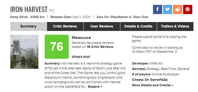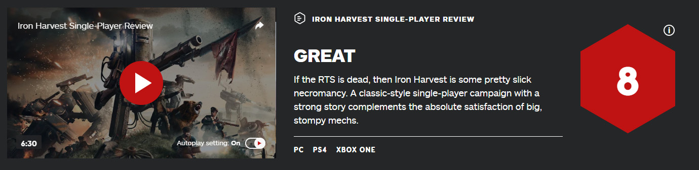 即时策略游戏(RTS)《钢铁收割(Iron Harvest )》已于昨天正式发售,Steam国区179元,支持简体中文。目前IGN为本作的单人战役打出了8分评价,而在Steam上本作评价为“多半好评”。 IGN评分:8分,优秀 如果说RTS游戏已死,那么《钢铁收割》就是一个相当狡猾的巫术。经典风格的单人战役与强大的故事相辅相成,绝对满足大块头机甲的需求。 总评: 《钢铁收割》承诺了一个光明的未来,因为实际上在2020年兑现一个经典RTS战役的承诺说起来容易做起来难。尽管本作的战斗不像该类型其他伟大作品那样专注于战术复杂或是策略,但它的单人战役仍提供了非常出色的任务。可能最大的惊喜是在这个架空历史的独特柴油朋克世界中的剧本和叙事,这在RTS游戏中算得上名列前茅。它不是一个即时经典,但也绝不是一个被你很快忘记的游戏。 评测视频: PC Gamer:8.2 《钢铁收割》的基于机甲的策略可能有一点慢热,但报酬无疑是值得的。 The Gamer:8 尽管我更喜欢更有反应、速度更快的移动以及更好的控制,而不是这个新的RTS所提供的内容,但是《钢铁收割》还是以自己独有的方式强烈地交付了。不管你是《英雄连》的粉丝还是蒸汽朋克爱好者,它绝对是一个必买游戏。即使你仅是一个现代RTS游戏粉丝,但《钢铁收割》仍然是一个很难错过的体验。 DualShockers:8 《钢铁收割》对于该类型的资深玩家来说,感觉并不像一款RTS。就像它的机甲一样,它的某些部分感觉很笨拙。但过了它那锈迹斑斑的外表,《铁收收割》的内部是一个有趣和娱乐性十足的时间沉淀。这是我今年玩过的、少数让我完全沉浸在一个比赛中的游戏之一。只要启动它,突然间一个小时就过去了。你是如此地沉浸在你的策略、攻击你资源的敌人和你的单位中,以至于即使右上角有一个现实时钟,我仍发现自己在清晨的某个点上还在游玩。虽然它不能提供其他历史悠久的RTS游戏那样的快速游戏玩法,但如果你想寻找一种更可靠的体验,《钢铁收获》仍然值得你花时间。 WCCF:8 GameWatcher:8 Screen Rant:7 TheSixthAxis:7 Game Rant:7 |