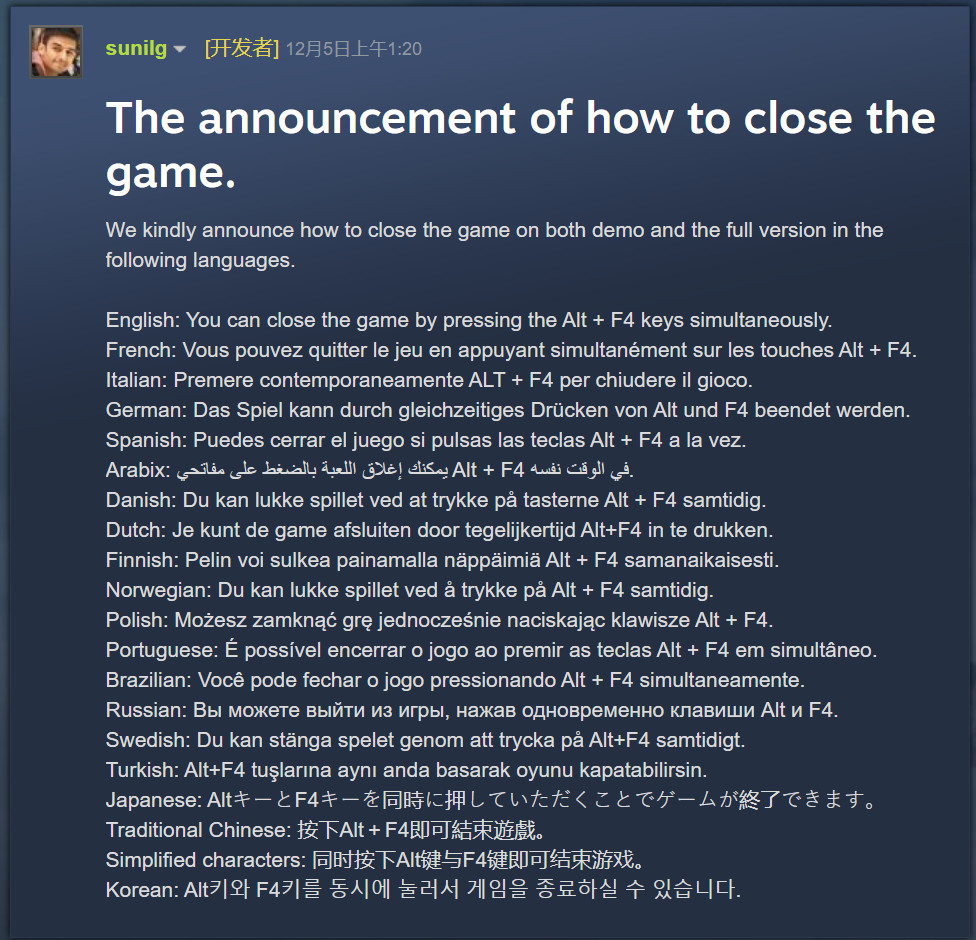 《勇者斗恶龙11 S终极版》于昨天正式在Steam平台推出,国区售价284元,自带简体中文。昨天官方在Steam社区中发布了公告,使用20种不同语言教玩家如何关闭游戏:同时按下Alt键与F4键即可结束游戏。