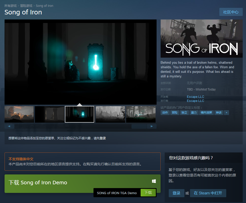 根据开发商兼发行商Escape LLC公开的相关消息,横版动作冒险新游《Song of Iron(铁之歌)》目前已经在Steam上推出免费Demo版本。 Steam商城页面截图: 游戏介绍: 《Song of Iron》是一款横版动作冒险游戏,玩家身处于被众神抛弃之地,王国也沦为了废墟。这里有可怕的怪物和一些凶狠的敌人,玩家需要使用斧子、弓箭,利用自己的先祖血脉和勇气来对抗一切威胁。需要注意的是,游戏中的箭矢会用完,盾牌也会有损坏的时候。 横版动作冒险新游《Song of Iron》目前已经在Steam上推出免费Demo版本,将于2021年春季登陆XBox和Steam平台,感兴趣的玩家可以关注一波。 游戏截图: |