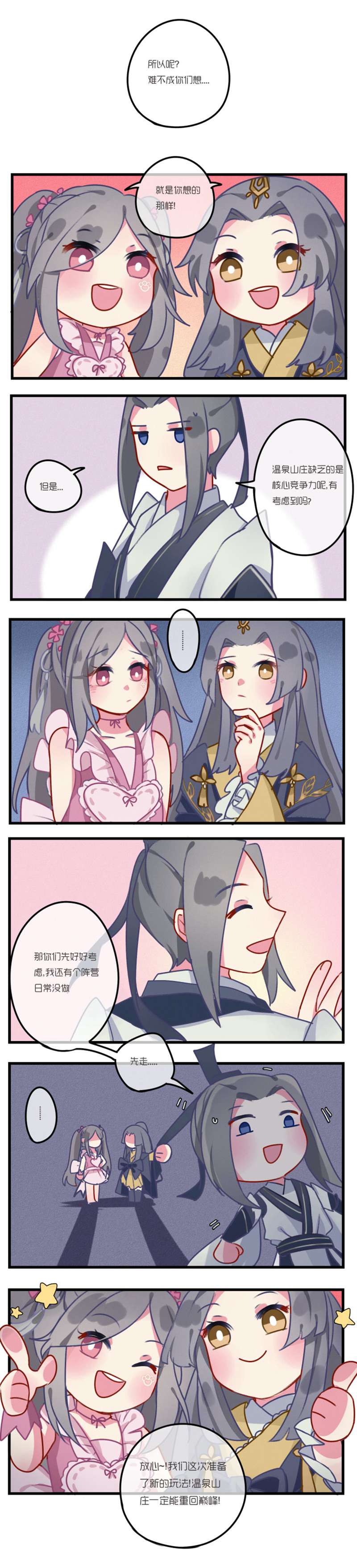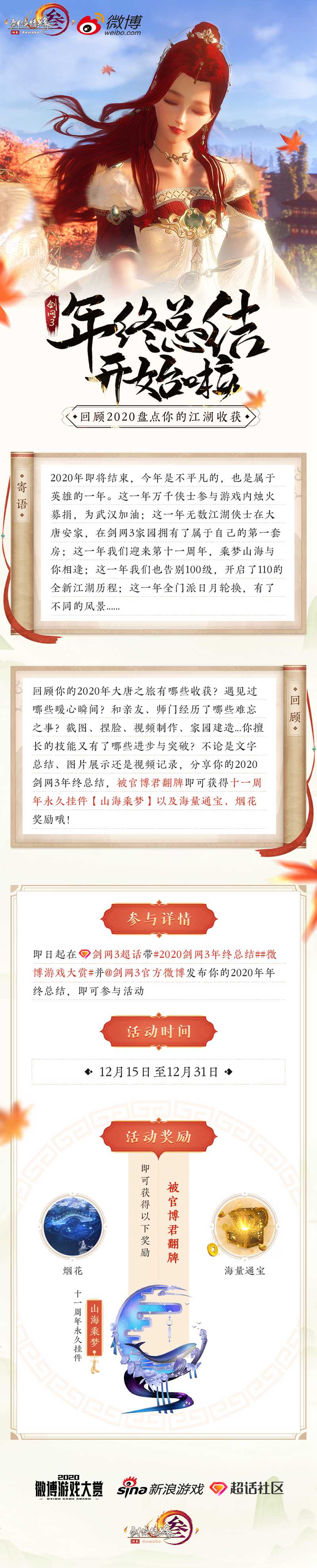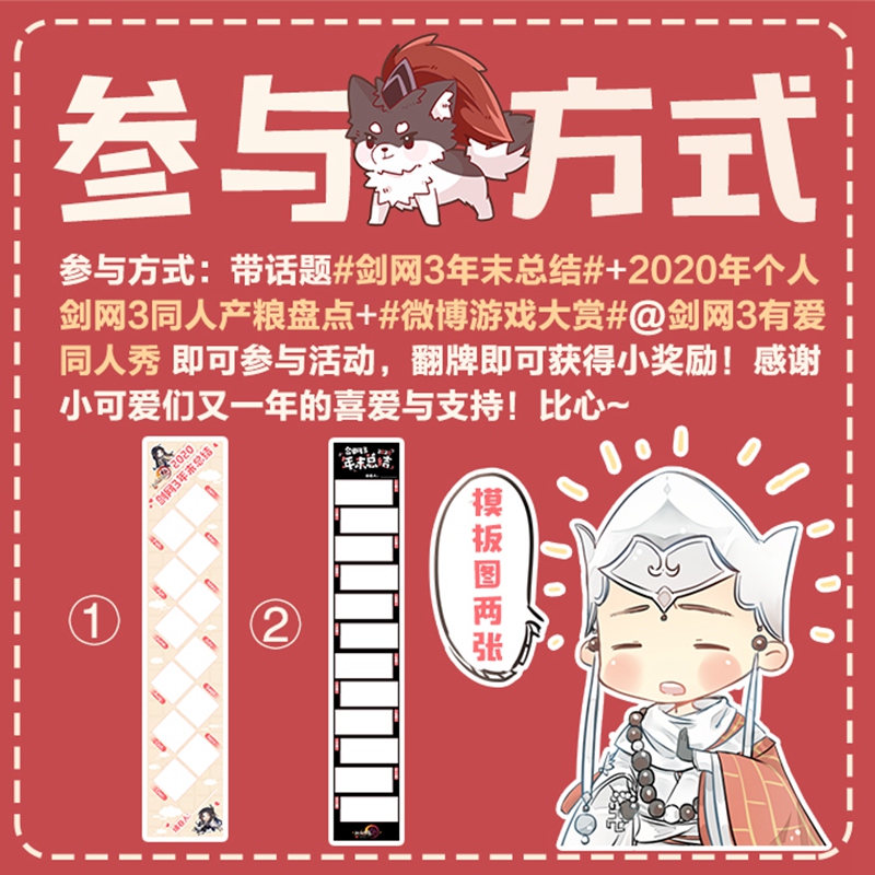 冬日晴空尚明媚,转眼已至年底,奔波辛劳了一整年的资讯君与小伙伴们相约寻一处清闲之地好好放松一下。漫步扬州闹市,却不想见到了一个熟悉的身影。昔日富婆“田甜”沦落街头,与甄香一同努力为“甜甜温泉山庄”招揽顾客。好奇的资讯君便上前打探一番,这才知道了原委。这些所见所闻在有爱同人作者@白棠林雀 的笔下便成为了生动的趣味漫画,今日就让我们一同来欣赏一下吧! 看完漫画想必侠士们一定非常好奇,究竟田甜与甄香为大家准备了怎样有趣的新玩法,能够让温泉山庄重回昔日繁华热闹的景象呢?资讯君也在努力为大家打探更多爆料,还请诸位保持关注! 【美好回忆共铭记 年终总结赠好礼】 而随着2020年即将结束,小伙伴们也陆续开启了今年的年终总结。2020年令人难忘的记忆太多太多,这片江湖有过欢笑、有过感动、有过热血、有过不舍。2020年是属于英雄的一年,今年,万千侠士参与烛火募捐,为武汉加油祈福;今年,也有无数江湖侠士在大唐安家定居,享受舒适惬意的居家生活;今年,大唐江湖迎来了十一周年,你我相约,乘梦越山海,终会相逢;今年,我们在三生树看日出,在论剑台观夜雪,听少林寺的晨钟,赏东海蓬莱的日落……2020年有太多值得铭记的回忆,在整理材料之余,官博君也希望能够收到各路侠士对2020年的总结与回顾,一同记录所经历的点点滴滴,把最难忘的、最有趣的、最美好的记忆凝结成文字、图片或是视频,将快乐与感动在这片江湖中传递!即日起至2020年12月31日,侠士可前往微博#剑网3超话# 内分享你的年终总结,带话题 #2020剑网3年终总结# #微博游戏大赏# 并@剑网3官方微博 发布,被官博君翻牌即可获得永久款十一周年纪念背部挂件【山海乘梦】、缤纷烟花以及海量通宝奖励哦! 【有爱作者齐分享 精品同人佳作传】 做年末总结,赠精美好礼,如此盛景又怎能少得了有爱同人作品呢?这不,同人娘也带着丰厚的同人粮与大家分享,诚邀有爱侠士一起分享2020年创作的同人佳作!即日起至2021年1月10日,侠士可前往微博#剑网3超话# 内分享同人创作作品总结,带话题 #剑网3年末总结# #微博游戏大赏# 并@剑网3有爱同人秀即可参与活动,更有机会获得永久款十一周年纪念背部挂件【山海乘梦】、十周年同人嘉年华定制背部挂件【舞歌千城】、烟花【真橙之心】以及通宝奖励哦!当然,同人娘也贴心地为大家提供了非常好用的总结模板,以供有爱侠士们使用!还等什么?赶快来秀出你的作品,与各路侠士一同分享剑侠江湖情吧! 在最后,资讯君也要提醒大家不要忘记,《剑网3》冬至狂欢节12月21日即将开启,节日活动经典回归,再添全新模块等你来体验,还有可交互温泉家具人人可得,尽情享受安闲居家泡温泉的惬意,还可欣赏飞雪漫天的浪漫景色,静品雨落空阶的宁静与祥和。而全新上线的“家园蓝图库”伴随着家园全新便捷功能——问题组件批量调整的出现,定能为侠士们带来更加畅快的家园玩法体验!更有侠士们期待已久的《剑网3》大IP第三张音乐专辑《乘梦江湖》12月24日重磅来袭,与你共赏多情江湖最美的声音!《剑网3》冬至狂欢节,让这个冬天热闹非凡! |
