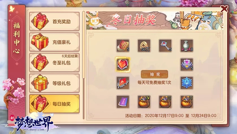 最新一季江湖秘宝录即将上线,全新翅膀、光环、脚印提前曝光,还有经典五人坐骑惊喜返场。另外,在本周游戏更新后,“冬日抽奖”活动将限时开启,每日登录游戏即可抽取多重好礼! 新一季江湖秘宝录内容前瞻 “碧玉龙晶,化羽成翅,雷轰电掣,龙游九霄”,限定4级强化翅膀“龙晶羽翅”和6级强化翅膀“惊雷龙翼”将于最新一季江湖秘宝录绚丽登场,还会有配套的全新光环和脚印同步上线。除此以外,经典五人坐骑“天瑞祥云”也将在这一季惊喜返场。 12月17日维护后,在状元坊、盛世长歌和长风破浪服务器提前测试,测试无误后将全服开放。 冬日送好礼 免费抽大奖 ? 12月17日至12月24日,各位少侠只要每日登录游戏就可以进行一次免费抽奖,抽奖即有机会获得神兽祝福石、仙兽祝福石、随机高级兽诀等丰厚奖品。零门槛抽奖活动限时开启,少侠们赶快登录游戏前往参与吧。 全国争霸赛情怀召回视频即将温情发布 全国争霸赛情怀召回视频将在本周五温情发布,视频讲述了一群少侠在梦想世界里的悲欢离合,经历失败后的久别重逢与重新出发,这是一个关于约定的感人故事。 届时,视频将会在全国争霸赛相关活动页面和游戏官网视频专区上线,感兴趣的少侠不妨前往欣赏一下吧。 关于《新梦想世界》 《新梦想世界》,国风武侠回合战斗网游,十三年经典回合IP,以主修辅修双流派的强大招式体系,继承见招拆招、相生相克的策略战斗特色;同时打造深度游戏世界观,全新美术升级,明月如初,国风新起,这一次,江湖等你缔结侠缘! |