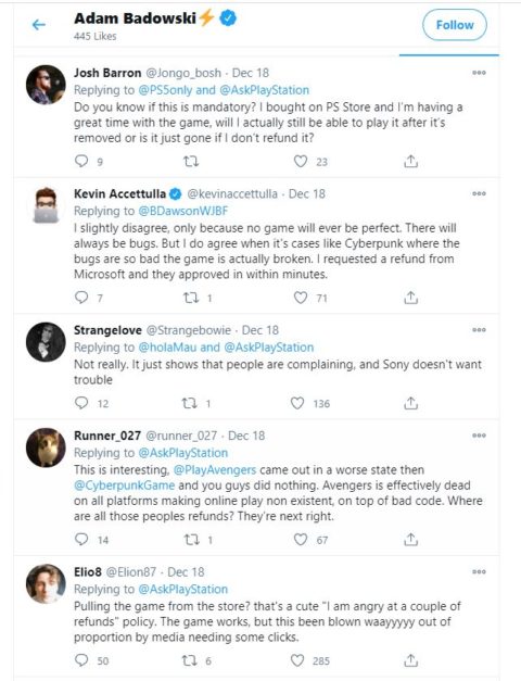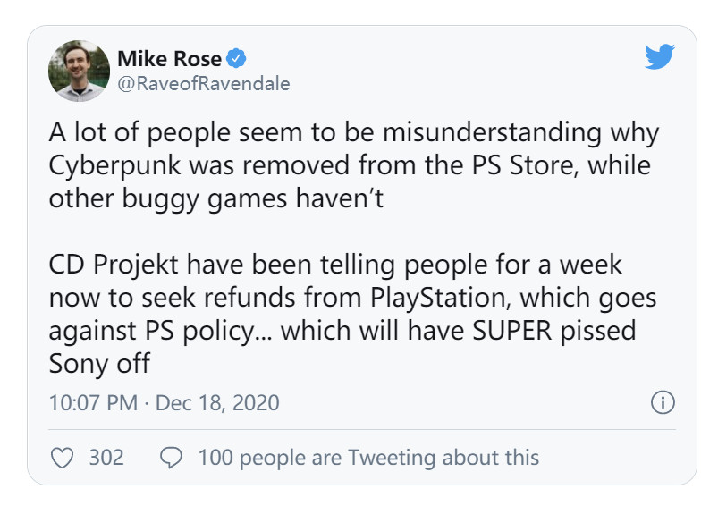 前不久索尼从PS商城下架了《赛博朋克2077》,CDPR官微也发布声明,表示“经过和PlayStation的讨论,我们双方一致同意,暂时在PS商城发行《赛博朋克2077》数字版”。然而外媒发现CDPR的老大似乎对索尼下架《赛博朋克2077》一事儿颇有怨言,他在Twitter上点赞了玩家批评索尼下架《2077》的推文,在被发现后,又全部取消了点赞。 Adam Badowski是CDPR工作室的老大,同时也是《赛博朋克2077》的游戏总监,被VGC发现点赞了在周五发布的批评索尼决定下架《赛博朋克2077》的推文。他共点赞了7条这样的推文。 其中一个推文批评索尼下架游戏的决定太过于荒谬。这条推文说:“这个游戏仍然可以游玩,据我所知,实际上还是一个很不错的游戏,为什么不等待他们推出一些补丁,更新呢?” 被Badowski点赞的第三条推文甚至还批评了《漫威复仇者联盟》,这个游戏首发也是灾难性的,并且质问索尼为什么不对这个SE的游戏采取类似的举动。 “这太有趣了,《漫威复仇者联盟》发售时的状态比《2077》还差,而你们也啥也没做。除了糟糕的代码外,《漫威复仇者联盟》在所有平台上都已死亡,在线游戏也不复存在。那些人的退款呢?他们是下一个吧。” Badowski点赞的另外一个推文鼓励买了《2077》的玩家不要退款:“我要告诉每个买了这个游戏的所有人,不要退款。CDPR会修复这些错误。所有的《巫师》游戏也都是垃圾当他们刚出炉时,看看现在的它们。” 对于《赛博朋克2077》的下架,虽然看起来双方都发表了“一致声明”,但似乎这一表象的背后有着另外一番故事。 游戏发行商No More Robots的创始人Mike Rose上周五时发推,猜测索尼决定下架《赛博朋克2077》可能是对CDPR建议PS4/Xbox One玩家退款的报复,CPPR建议玩家退款显然违反了索尼的退款政策。 “很有可能的情况是,CDP开始告诉人们去退款的那一天,索尼立刻联系了CDPR,说一些【如果你告诉人们退款我们需要将你的游戏从商城下架】之类的话。然后CDPR慢悠悠、十分不情愿地同意。 我当然不清楚这个中的细节,但这确实是有可能发生的事情。这个事情最大的禁忌是在没有和索尼事前商谈的情况下:违背索尼的政策,然后把索尼的客服挤爆。” 12月14日CDPR发布了致歉声明,建议玩家退款,并鼓励玩家联系索尼和微软。就在这个声明发布不久后,很多玩家反应索尼和微软拒绝退款《赛博朋克2077》。CDPR然后又解释称在《赛博朋克2077》游戏上他们没有事先和索尼,微软达成特殊的协议。 12月18日,索尼率先发布声明,宣布将《赛博朋克2077》从PS商城下架,所有从PS商城购买了游戏的玩家可退全款。 12月19日,微软发布声明,宣布“拓展现有的退款政策”,承诺从微软商城购买了《赛博朋克2077》的玩家可退全款,但没有下架《赛博朋克2077》Xbox版游戏,玩家仍然可以购买。 Mike Rose:很多人看起来对《2077》从PS商城下架而其他bug游戏没有下架有误解。在过去的一周中,CDPR一直告诉人们去PS那里退款,这显然是违背PS商城的政策,这也让索尼超级恼火。 |