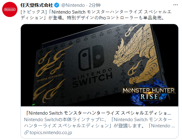 今日(1月27日),任天堂官方公开了《怪物猎人:崛起》主题NS主机的更多相关情报,此次展示了该主机的样品截图,同时确认该主机和限定版主题NSpro手柄将于2021年3月26日与《怪物猎人:崛起》游戏同日上市,主题NS主机售价38400日元(不含税),主题NS?pro手柄售价为7480日元(不含税)。