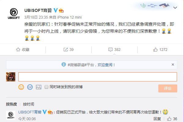 育碧官博数天以前预告的春季促销活动,在3月18日当天却出了岔子。直至当晚23点35分官方才发出了一条新公告,确认本次的春季促销活动由于出现了技术性问题才没能准时上线。 最终在育碧的紧急修复下,春季促销活动在今天凌晨这才得以正式开启。 对于玩家“英灵殿五折选择忘记,三折不离不弃,一折反向洗地”的评论,官方并没有放在心上依然我行我素。事实证明当了这么多年大哥的育碧,早就不兴“顾客就是上帝”那套了,玩家们除了这条道歉信息,并没能在活动中落着什么切实的好处。 去年发售的三款3A游戏,在本次的春季促销中都按照自身的热度和玩家口碑给出了不同的折扣价格。《刺客信条:英灵殿》作为育碧近几年来品质最好的游戏之一,在春季促销活动中被开出了75折的优惠价格,标准版仅售223.5元。 《看门狗:军团》发售后的表现则让许多玩家都感到比较失望,在这个系列的口碑一部比一部差的情况下,《看门狗》是否能够推出第四部都已经成了未知数。《渡神纪:芬尼斯崛起》也与前者一样,虽说在近期都将上线新DLC,但发售不足半年价格却迎来了腰斩,这足以说明广大玩家对它们并不感冒。 去年发售的游戏,大家基本只关注《刺客信条:英灵殿》的价格。不过在众多先前发布的作品中,却也不乏值得玩家一买的游戏。比起《看门狗》一代和三代昏暗压抑的场景,《看门狗2》完美的还原了旧金山的风景地标及阳光;《孤岛惊魂》系列也很对部分育碧游戏爱好者们的胃口。 如果你想要将本次的春季促销折扣拉到最大的话,标准版仅需74.5元的《刺客信条:奥德赛》必是首选。因为根据本次促销的活动规则,选购其他游戏与《刺客信条:奥德赛》 一同结算,即可获取整单额外8折优惠。当然,也包括《刺客信条:英灵殿》。 总体来说育碧商城的这次春季促销活动没有什么超出玩家预期的惊喜,表现上来说只能算是中规中矩。部分没有太迫切需求的玩家,不妨再观望观望。兴许到了夏促的时候,《刺客信条:英灵殿》也能来个五折也说不定。毕竟等等党永远不会输。 |