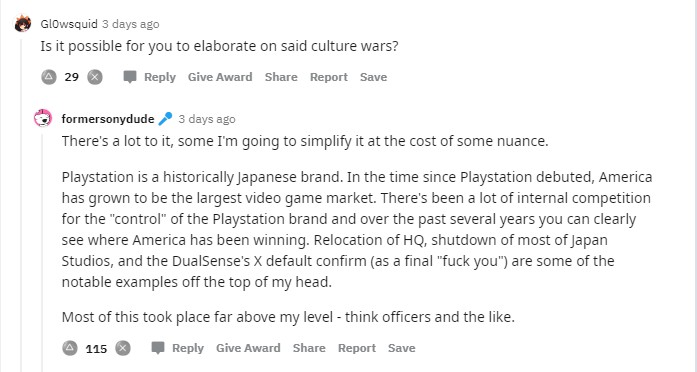 一位名为“formersonydude”的Reddit用户近日发帖,自称在索尼工作多年,曾任职于PSV部门。他表示索尼对PSV的处理方式令人憎恶,也感到失望,因此来到Reddit向玩家介绍幕后发生的事情。 Reddit管理员在与“formersonydude”沟通后,确认其索尼前员工身份属实。 有玩家提问:“你能详细解释一下索尼内部的文化战争吗?” formersonydude回答道:“这可以说的太多了,我尽量简化一下,可能会有细微差别。” “Playstation是一个历史悠久的日本品牌。自从Playstation首次亮相以来,美国已经成长为最大的电子游戏市场。对于Playstation品牌的“控制权”存在许多内部竞争,在过去几年里,你可以清楚地看到北美团队在哪些地方取得了胜利。总部的搬迁,大多数日本工作室的关闭,以及PS5手柄的改键(真是淦了),这些就是我脑海中浮现的一些显著的例子。” “而这些大都发生在远超我这个级别的人能触及到的地方——想想高管之类的人。” |