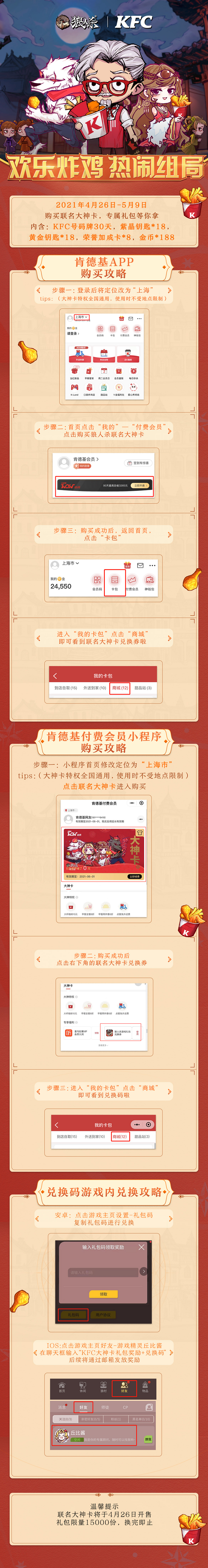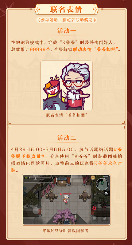 欢乐炸鸡,热闹组局!《狼人杀官方》X肯德基梦幻联动正式开启,即日起参与活动,不仅能获得“K爷爷”联名款时装,还有机会获得限定号码牌等诸多游戏福利,更有联动电子卡面、线下主题门店等多场福利等你来解锁! 【K爷爷联名时装来袭,穿时装解锁趣味表情】 活动期间,“跑跑狼人杀”X肯德基联名时装“K爷爷”惊喜上线,穿戴时装参与跑跑狼人杀对局还有机会解锁趣味联名表情“爷爷扣桶”,参与话题站“爷爷赐予我力量”话题活动,分享穿戴“K爷爷”时装的游戏内截图或同款表情,就有机会获得永久时装! 【肯德基联名大神卡上线,加入会员得专属卡面】 肯德基联名大神卡上线,玩家们可通过肯德基APP和小程序两种方式购买,成功购买后前往“我的卡包”点击商城即可领取狼人杀专属兑换券,即可兑换包括KFC联名号码牌在内的超多超值道具奖励! 【主题店联名套餐同步来袭,美味尽在掌握】 活动期间还有狼人杀X肯德基联名主题套餐等你来品尝,不仅能享受美食,还能够获得包含“K爷爷时装”在内的专属兑换码。同时线下主题门店同步上线,女巫、预言家、摄梦人邀你享受各式美味! 4月26日——5月9日,狼人杀x肯德基联动活动正式开启,快来品尝美味炸鸡,开启热闹狼人杀之旅吧! 关于《狼人杀官方》—— 《狼人杀官方》一直以来致力于游戏玩法的打造,力求给玩家带来最满意最优质的玩法体验以及游戏环境,积极开拓全新玩法,女巫、守卫、摄梦人、魔术师、猎魔人等板子应有尽有。更有全新模式“跑跑狼人杀”重磅来袭,三分钟爆笑推理,随时随地来一局,欢声笑语乐不停!实景操作古风Q萌小人嗨翻浪漫碎叶城,狼人钻地道、搞破坏,好人喂黑猪、炼仙丹,更多逗趣任务等你来解锁!快来狼人杀官方,和全网年轻人热闹组局! |