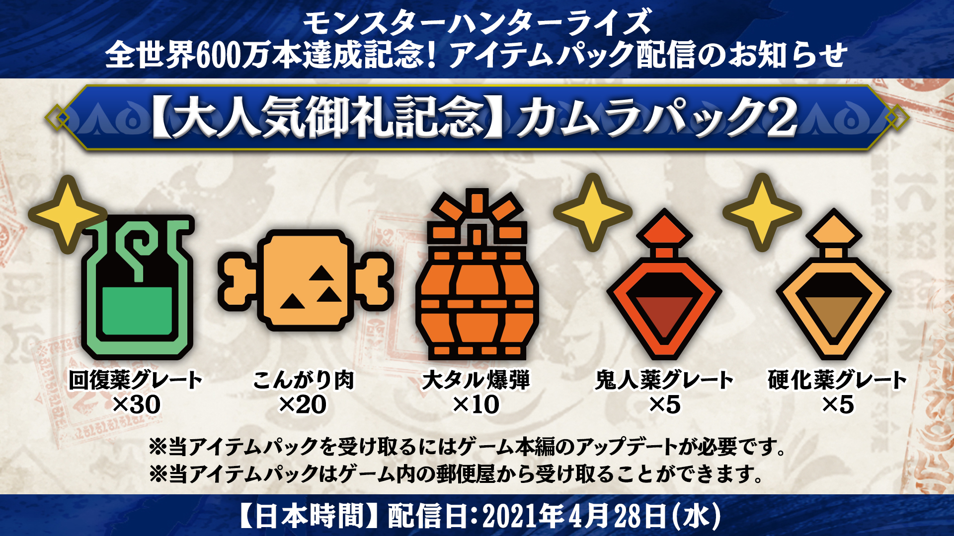 卡普空今日官方宣布《怪物猎人:崛起》的实体出货+下载版销量已突破600万份,为庆贺此事官方赠送“炎火村道具包2”。玩家可以在邮差猫NPC处领取这一礼包。 从此次公布的道具包细节来看,此次官方赠送回复药G 30个、烤熟的肉20个、大桶爆弹10个、鬼人药G 5个、硬化药G 5个,玩家可前往村中邮差猫NPC处领取这些奖励。 在4月28日发布的《Monster Hunter Rise》“免费游戏更新Ver.2.0”中,登场的追加怪物有古龙霞龙、炎王龙与钢龙,以及新的霸主怪物。还会推出可挑战霸主怪物的普通任务、开放猎人等级以及时髦猎人最爱的生产外观装备功能。此外,《怪物猎人:崛起》V3.0版更新将在5月末发布。 感兴趣的玩家可以尝试一下《怪物猎人崛起》这款游戏。 |