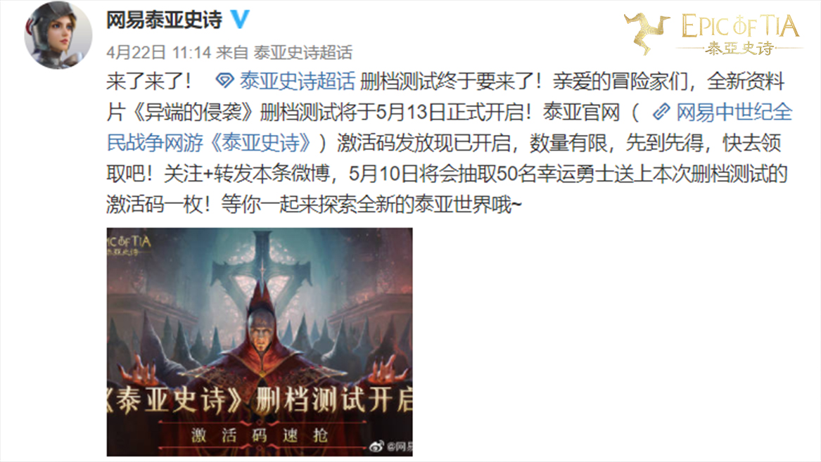 《泰亚史诗》作为网易首款中世纪全民战争网游,由于其设定庞大严谨而受到广大游戏爱好者的喜爱。目前,泰亚史诗全新资料片《异端的侵袭》即将进入删档封测阶段。为保证游戏内容的神秘性以及服务器的稳定,制作团队面向玩家开放小部分体验名额,旨在与玩家共同完善新版本,推进游戏内容的优化。 【泰亚史诗开启删档测试,玩家期待值高涨】 近期,“限量、先行、删档、激活码”成为网游《泰亚史诗》最新版本内测的四个关键词。随着全新版本内容的陆续曝光,新老玩家对改版后的内容讨论尤为激烈,期待值亦是愈发高涨。5月13日,《泰亚史诗》全新资料片《异端的侵袭》将进行删档测试。如今,游戏激活码也陆续在各个平台开始发放。激活码发放的消息一出,求码的呼声就从官方渠道迅速扩散到论坛、贴吧等平台,产生了供不应求的现象,《泰亚史诗》全新版本更是一跃成为游戏玩家群组之间的热点话题。 【激活码限量发放,抽奖领码送福利】 为了让更多的玩家能够提前感受《泰亚史诗》的新资料片《异端的侵袭》,官方在微信公众号、微博、贴吧和论坛等各个渠道均组织了激活码发放活动,保证活跃在不同平台的游戏玩家都有获得激活码的机会。 玩家可以通过以下途径获得激活码: ①登录《泰亚史诗》游戏官网,点击注册下载游戏后,即可一键领码并领取豪华入驻礼包; ②4月22日-5月9日,关注《网易泰亚史诗》微信公众号,在激活码发放相关推文中参与留言讨论。点赞数前20的玩家将直接获得激活码,另外还会随机抽取30位玩家赠送激活码; 《泰亚史诗》官方微信公众号 ③转发《泰亚史诗》官方微博参与抽奖活动; ④持续关注《泰亚史诗》官方贴吧、论坛等渠道,参与爬楼活动赢取激活码; ⑤加入《泰亚史诗》官方QQ群,参与群内讨论,获取激活码。 《泰亚史诗》官方QQ群 本次激活码为限量发放,先到先得。成功领取到激活码的勇士将会提前进入游戏,体验全新资料片。 【全新资料片即将上线,抢激活码称霸泰亚大陆】 《泰亚史诗》新版本测试阶段内,研发团队将根据玩家体验后的意见再次优化新版本内容。有幸体验到测试版本的玩家不仅可以帮助研发团队完善升级游戏内容,还可以提前体验到大量极具中世纪风情的传奇元素和历史故事。本次全新资料片经过研发团队的精确把控,在细节上更为精致细腻,故事背景更为丰富,升级后的世界观架构为玩家提供了一个原汁原味的中世纪环境。可以说,《异端的侵袭》资料片不仅是《泰亚史诗》核心玩法的延续,更是泰亚游戏整体属性的升级优化。无论是新手玩家还是老玩家,都可以在全新版本中获得沉浸式的游戏体验。 还等什么?将激活码收入囊中,去成为中世纪的领主,纵情驰骋在这片全新的土地上吧!勇士们,拿起武器,你们的荣誉需要自己来捍卫! |