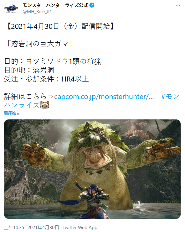 在之前举行的《怪物猎人》特别直播活动中,除了2.0版本追加的新怪物之外,还展示了众多的活动任务。今天,《怪物猎人崛起》首个活动任务“熔岩洞的巨蛙”正式解锁,完成任务可以解锁肢体动作“忍术”。