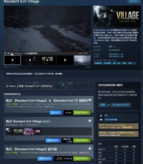 《生化危机8:村庄》Steam解锁:标准版国区售价396元