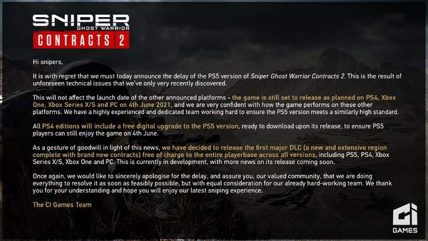 《狙击手:幽灵战士契约2》PS5版跳票 首个DLC免费送