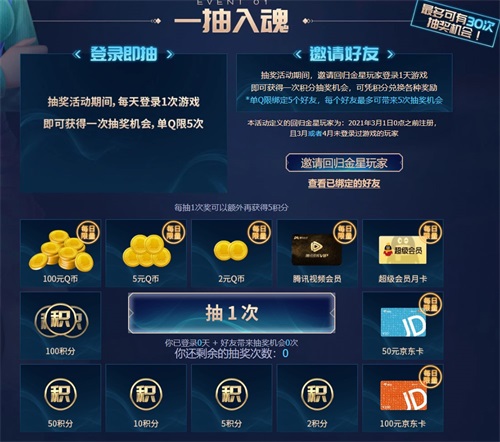 周年庆超级幸运星来啦! 活动时间:2021年5月7日-2021年5月31日。 活动链接:https://x5.qq.com/cp/a20210419jcq/page.html 本期活动,超级金星玩家可通过以下2种方式获得共30次抽取奖励的机会,赢取Q币、现金、京东卡、超级会员、腾讯视频VIP等奖励。 1、活动期间,每天登录1次游戏,可获得一次抽奖机会,单Q限5次。 2、活动期间,邀请回归金星玩家登录1天游戏,可获得1次积分抽奖机会。单Q限绑定5个好友,每个好友最多可带来5次抽奖机会。 回归金星玩家:2021年3月1日0点之前注册且3月或者4月未登录过游戏的玩家。4月回归玩家也为回归金星玩家) 抽奖后,可消耗对应的抽奖积分,兑换现金红包、紫钻、视频会员和超级会员! 兑换紫钻(31)天仅需5积分!即抽1次奖即可领取紫钻31天! 累计抽奖5、10、15次,可分别任选1个首发限定名片动作,不可重复选择;累计抽15次后,可领取双人坐骑。 最后别忘周年庆专属-超值收益大礼包,只需0.1元带走10时效皎月礼盒。 其他注意事项: 1. 京东卡将以电子卡(卡号+卡密)形式在活动结束后15个工作日内发放至抽奖账号游戏邮箱。 2. 现金将直接到账QQ钱包,兑奖前请提前绑定QQ钱包并进行实名验证。 |