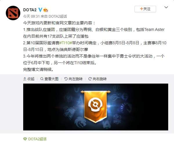 除此之外,官方还提到近期游戏内更新内容的信息,一是战队应援团功能,应援团籍分为青铜、白银和黄金三个级别,包括TeamAster在内目前共有17支战队上架了应援包。二是今年将推出两个单独的活动而不是像往年一样集中于勇士令状的大活动,一个位于6月中下旬,另一个将在TI10结束后。
