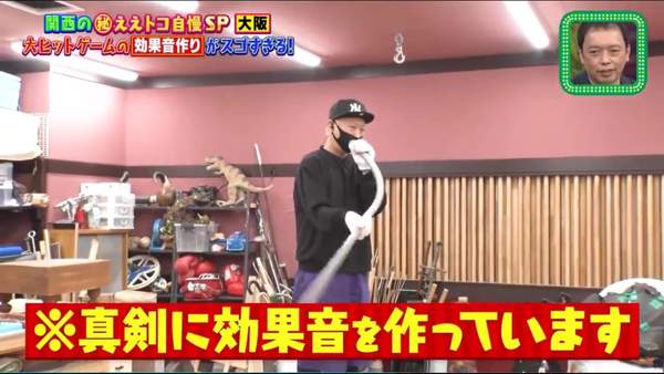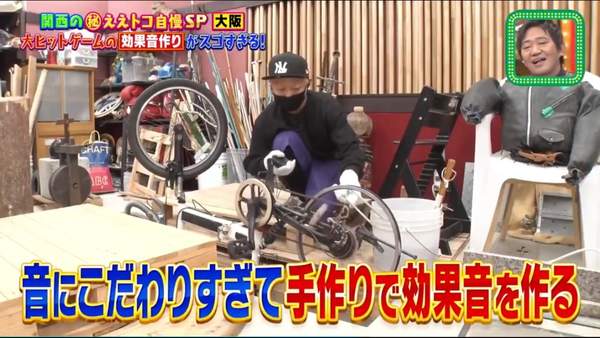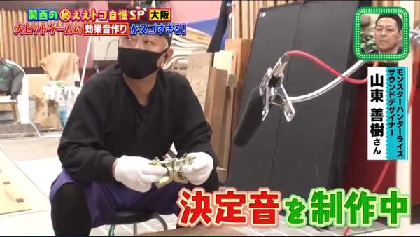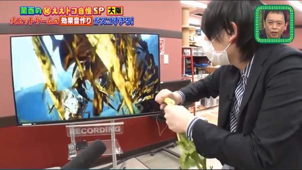 视频中,制作人员说明并演示了部分音效的“出处”。泥翁龙尾巴的声音来自手撕芹菜,磨刀的声音来自水泥抹子,菜单音效是五金件的声音,跑步时的铠甲碰撞声是往员工女儿用了6年的双肩包里塞金属录制的,最骚的是怪物介绍里的号角声,是边甩软水管边吹气录的……
