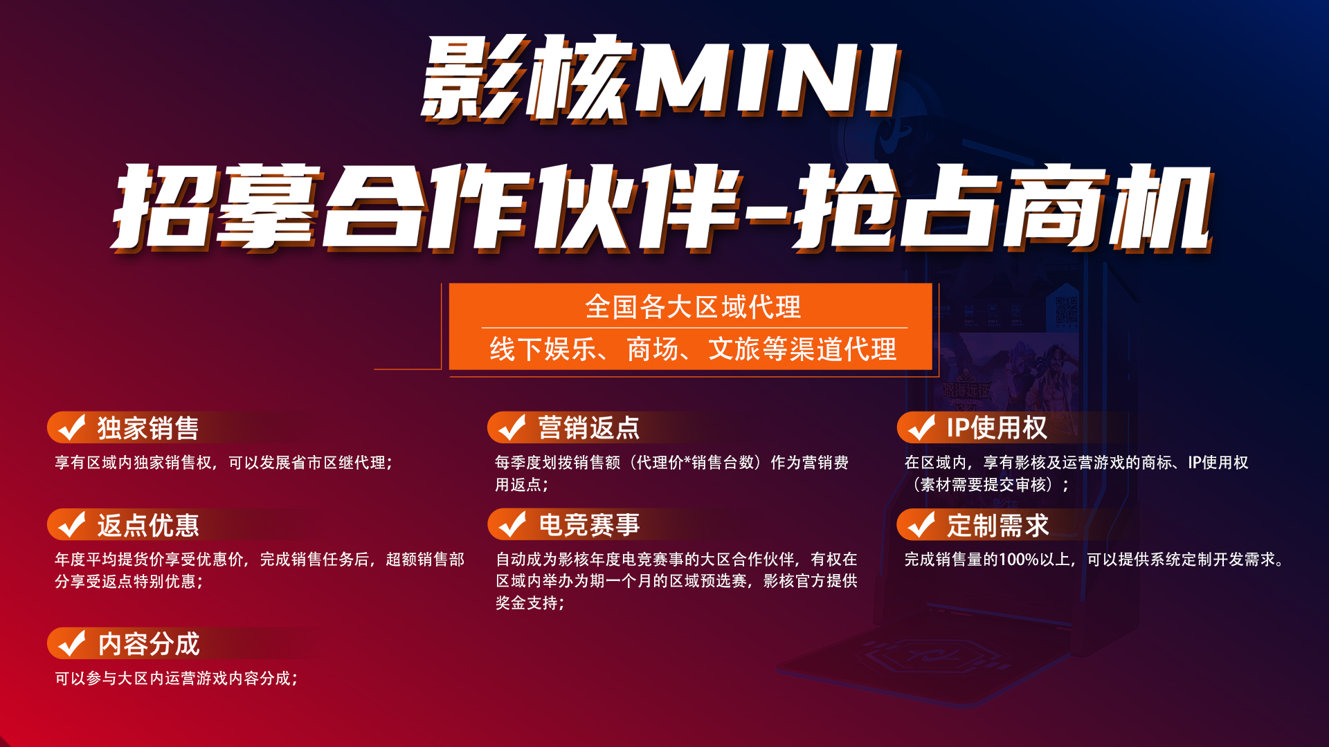 5月10日,由网易影核出品的全新线下VR娱乐终端亮相鸿威展,吸引了众多线下娱乐运营者、文旅项目负责人的关注,走出了影核向线下娱乐终端布局的新步伐。展会期间,网易影核还依托影核mini在鸿威展现场开展了为期两天VR电竞大赛,万元奖金池吸引了大量玩家参与,开创了VR行业展会的新玩法。 影核mini——打造5G时代的线下竞技终端 作为为数不多的布局VR产业的游戏厂商,网易一向非常看好VR行业的未来。网易影核成立以来一直围绕VR生态进行全方位的打造,此次推出的影核mini也是针对疫情后线下市场的实际困难应运而生的一体化解决方案。 1. 小成本模组解决方案 影核Mini,以低成本、低占地面积及一体化的特点铺设线下业态,能降低商家运营成本。 同时,针对线下场景推出了实时分账体系及运营导量系统,帮助商家收益提升。 合作伙伴在购买自助机后,可自行选择投放点位完成投放,影核初期会为合作伙伴支持四款免费的VR游戏,后续也会持续推出付费更新的新游戏。这种合作模式同时适用于中小型合作伙伴及大公司的战略型项目,不同的方案也对应不同的机器价格和运营模式。这部分可以让很多担忧房租成本的商家带来简洁、一体化的解决方案,是以低成本即可盈利的方法。 2.全球精品游戏内容持续更新 不断增强产品活力 影核mini依托网易影核的VR游戏分发平台,能实现游戏内容的持续更新。据悉,影核mini现共有6款内容,其中4款可供合作商家免费使用,2款采用内容分成的形式向合作商家开放。后续还将维持每季度更新一款游戏的频率,通过内容更新不断为线下终端赋能。 值得一提的是,影核平台的所有游戏,都达到国际顶尖VR游戏的品质标准,且全部具有正版授权。对比国内较为混乱的VR游戏内容版权环境,可谓是优势凸显,带给玩家的优质体验感也是其他同类型产品难以比拟的。 ?《节奏空间》(英文名:Beat Saber) 《Beat Saber(节奏空间)》是一款由Beat Games开发的独特的VR节奏游戏,网易影核是该款游戏的国内唯一官方代理商。每一次挥舞光剑切割方块都伴有优质的声音与视觉效果来凸显音乐的动感节拍。该游戏上线首日就牢牢占据Steam VR游戏日活用户榜首,在Steam平台上所有游戏(包括PC游戏)中好评度位列总榜第七。 ?《缤纷泡泡》(英文名:Glimmer Grove) 《缤纷泡泡》是一款由美国知名VR游戏制作商Survios开发的轻松休闲消除VR游戏。玩家置身于真实奇幻的童话世界,在五彩斑斓的矿石洞穴之中化身为可爱的小女巫,利用手中的弹弓击中水晶泡泡完成消除任务,挑战重重关卡。 ?《义庄派对》 在游戏中,玩家将要扮演一名来自东方的除妖术士,与助手“猪头”并肩作战,来到义庄,将义庄中的恶灵彻底消灭。游戏最经典的设计,在于完全遵从中国僵尸的打法,什么枪炮通通没用,身为术士的玩家需要在黄纸上写出符咒攻击僵尸,还有家传的桃木剑辅助,这样的灭妖方式非常具有东方特色。 ?《怒海远征》 《怒海远征》采用先进物理环境引擎,真实模拟海洋环境,还原幻想中的海上作战。独家研发沉浸式交通系统,真实模拟远洋航行真实体验,支持单人模式及多人协作模式,最多支持10人互动大乱斗。 ?《甜点盛宴》 《甜点盛宴》是一款画风甜美的休闲类VR游戏,玩家要把成百上千个不同的甜甜圈切成薄片,然后爬到排行榜的顶端。尽可能多切片,并利用魔术清除飞行甜甜圈。避免任何来袭的炸弹获得最高级别! 发挥网易影核电竞优势,VR竞技体系赋能线下运营 2020年,在 VR 游戏发展陷入停滞时,网易就携自己独家代理的国外知名 VR 音游 《节奏空间》(英文名:Beat Saber)强势入场,举办了国内首个成体系、成规模的 VR 电竞赛事,给这片发展逐渐陷入低谷的科技沃土,灌输新的动力源泉。 网易影核CEO曹安洁表示:影核希望能够基于优质的内容打造一个满足不同玩家群体的VR电竞生态。VR游戏因为交互的革新给了我们更加多样的比拼维度,我们希望在传统电竞的基础上打造一个更多样的舞台,更多的玩家可以通过不同的项目,不同的比拼方向,展示最棒的自己。 随着影核mini线下娱乐终端的推出,影核将布局更加高频的线下电竞活动。将影核mini 与影核平台串联,使每一个线下终端既能成为影核年度竞赛的赛点,又能成为单独小型赛事的主体,定期举办小型的电竞比赛,搭建更加多维的VR电竞体系,让更多的玩家加入到VR电竞的活动中来。这将大大丰富VR电竞的种类和参与人群,我相信VR游戏电竞终将会改变电竞是年轻人狂欢的局面,逐渐变成大众群体的主流娱乐选择之一。反之,通过搭建电竞赛事体系又可以提高VR内容的复购和用户参与感,为影核mini的合作伙伴提供了更多运营盈利空间,以“内容+运营”反哺线下合作伙伴。 在本次鸿威展现场,影核也举办了以《节奏空间》和《源代码》为内容的电竞比赛,赛程共两天,有上百名现场选手参与了比赛,争夺万元大奖。除了丰厚的奖金,前三名的选手还有希望进入影核2021年度电竞总决赛,与全国高手同台竞技。 本次电竞赛完全依托影核mini进行,玩家可以通过影核mini自主选择游戏进行参赛,系统将自动记录分数,可实时监测在该赛点、全国的分数排名。这种简便高效的电竞活动形式,可以直接复制到任意一个影核mini线下终端网点,吸引了大量前来采购的合作伙伴。 开启全国代理招募,共创线下VR竞技新局面 此次鸿威展,影核还公布了针对影核m
