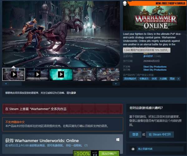 Steam喜加一:回合制卡牌游戏《战锤地下世界OL》免费领取