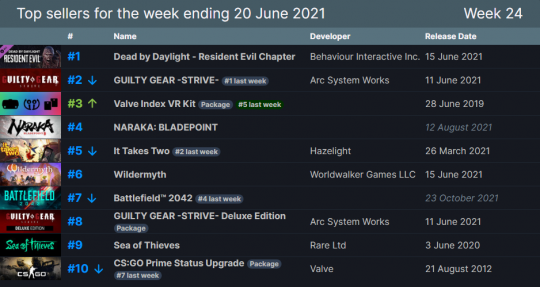 6月14日至6月20日的Steam平台销售情况排行榜已经公布出来了,这一周的销量冠军是《黎明杀机》与《生化危机》联动的全新DLC。而上一周的销量冠军《罪恶装备STRIVE》滑落第二名,第三名是Valve Index VR套件。国产游戏《永劫无间》登上前五,获得了第四名的好成绩。 以下为V社公开的销售排行: 1)《黎明杀机》生化危机章节 2)罪恶装备:STRIVE标准版 3)Valve Index VR套件 4)永劫无间 5)双人成行 6)漫野奇谭(Wildermyth) 7)战地2042 9)盗贼之海 10)CS:GO - 优先状态 《黎明杀机》×《生化危机》联动章节DLC售价41元,包含一名新杀手:Nemesis(追踪者);两名逃生者:里昂·S·肯尼迪和吉尔·瓦伦蒂安;以及一张新地图:浣熊市警局。 |