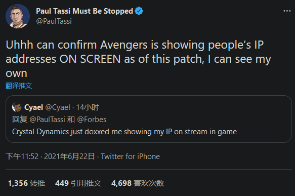今天,SquareEnix推出了《漫威复仇者联盟》的更新补丁。这是一个日常维护,但是玩家在更新后就在社交媒体上反馈称,更新后打开游戏,屏幕上暴露PS5玩家的个人地址。随后,玩家和记者在推特上分享了经过编辑的屏幕截图,以展示IP信息在游戏中是如何出现的。 在问题被发现后短时间内游戏官方推特就发布公告称他们正在调查“屏幕上出现文本字符串的问题”。 过了大约两小时后,官方推特发文证实了该消息并提醒玩家等待修复:“我们目前正在测试解决个人信息问题的解决方案,包括玩家的IP地址和用户名,这些信息会显示在PS5的屏幕上,并计划在明天上午8点左右发布修复更新。” 官方推特补充道:“PS5玩家在此之前应避免直播或发布屏幕截图,因为可能会导致敏感信息泄露。” |