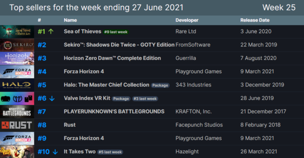 上一周(6月21日至6月27)Steam平台的销售情况排行榜V社已经公布出来了,这一次的销量冠军是刚与《加勒比海盗》联动推出“海盗生活”更新的《盗贼之海》。第二名是正在5折促销中的《只狼:影逝二度》,第三名是六折促销的《地平线:零之曙光》完全版。, 杰克船长 以下为V社公开的销售排行: 1)盗贼之海 2)只狼:影逝二度 3)地平线:零之曙光 完全版 4)极限竞速:地平线4 5)光环:士官长合集 6)Valve Index VR套件 7)绝地求生 8)Rust 9)极限竞速:地平线4 10)双人成行 索尼大作《地平线:零之曙光》在Steam商店迎来了特惠活动,游戏原价279元,现在打六折167元。游戏评价为“特别好评”,本次特惠截止日期为7月9月。 FromSoftware旗下动作游戏《只狼:影逝二度》在Steam商店开启了特惠促销活动,游戏原价268元,现在打5折,售价134元。游戏评价为“特别好评”,本次特惠截止日期为7月9月。 |