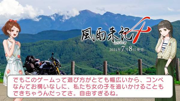由日本一、FOG制作经典冒险游戏《风雨来记4(Fuuraiki 4)》今天正式发售了,登陆PS4和NS平台。日本一公布了由游戏中的声优长野佑纪与河野日和担当介绍的概览预告。预告中描述了游戏中一整天玩家将经历的内容。一起来看看吧! 《风雨来记4》游戏介绍: 《风雨来记1》与《风雨来记3》将北海道设置为了游览地域、《风雨来记2》则是冲绳。而在《风雨来记4》中,我们将前往日本岐阜县,领略那里的风光。为保证浏览质量和细节,雅马哈摩托、日本岐阜县以及Arai Helmet(头盔制造商)都参与了游戏制作。 在《风雨来记4》中,玩家将作为一名作家骑行在日本岐阜的路上,并沿途寻找能够填写自己故事的素材、使用360度镜头记录自己骑行的路途的视频。您可以在路上欣赏路过的风景,也可以遇见可爱的女孩! 视频画面: |