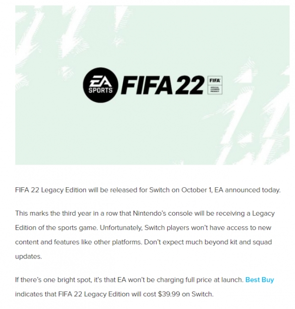 曝Switch《FIFA 22》又是遗产版 售价39.9美元