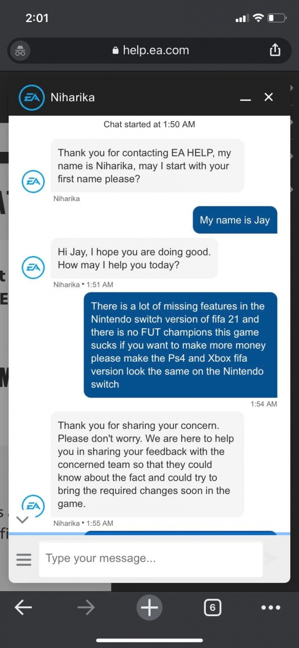 今天(7月12日),EA公布了《FIFA 22》的发售日期,将于10月2日登陆全平台。有国外网友爆料称,Switch版本《FIFA 22》又将作为遗产版,是任天堂主机连续三年获得体育游戏的遗产版,售价为39.9美元,低于其他版本,不少网友对此表示难以接受。 所谓的“遗产版”,基本上可以看作是更新了游戏中的球员阵容、赞助商、球衣等信息的版本,至于其他PC和主机版《FIFA 22》的新增要素、玩法以及机器学习增强的进攻和防守,Switch传奇版仍然欠奉。当然,游戏内容的缺失,也使得Switch传奇版《FIFA 22》的售价相对更低一些,以PS5和Xbox Series次世代版本《FIFA 22》的70美元售价进行对比,Switch传奇版《FIFA 22》仅售39.9美元。 《FIFA 22》确定于10月2日登陆各大平台。 不满的网友跑去EA客服里互动了一番,不过只得到了“我们会改进。”的回复。 |