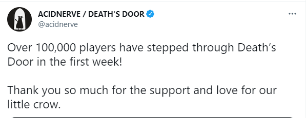 Acid Nerve在推特中表示,在发售不到一周的时间里,《死亡之门》已经有超10万名玩家玩过,虽然不能反应游戏的实际销量,但却是一个很重要的成就。