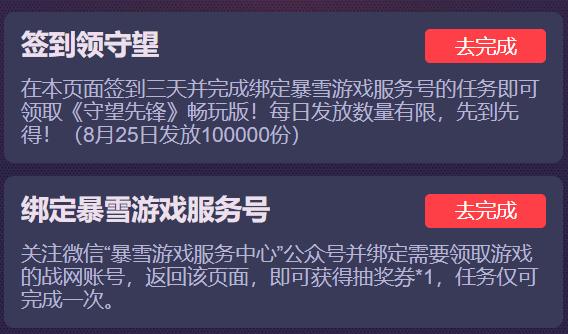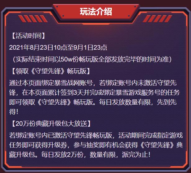 如果绑定的暴雪账号已激活《守望先锋》畅玩版,可以完成活动任务获得升级券,升级券参与抽奖有机会获得《守望先锋》典藏版升级包。每日发放2万份。