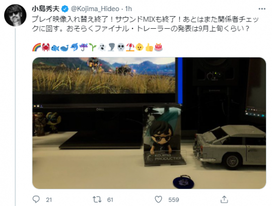 《死亡搁浅:导演剪辑版》将在下月末正式发售,登陆PS5平台。前段时间,游戏官方称游戏最终预告片的一些镜头的时机与音乐不吻合,为表现最好的效果,已经进行删改重拍,但是并没有公布预告发布时间,只能等待官方消息。 小岛秀夫日前表示:游戏的(实际)影像已经替换完毕!音效混合也完成了!之后就是与相关人士的沟通审查了,或许将于9月初公布终极预告。 《死亡搁浅(DeathStranding)》是一款由KojimaProduction制作SIE发行的开放世界类动作互动游戏,是小岛秀夫与小岛制作工作室(KojimaProductions)从科乐美独立之后发表的首款作品,在游戏中玩家既能享受到探索的自由度,也能体验到小岛秀夫游戏一贯的剧情要素,同时游戏还将提供在线内容。 |