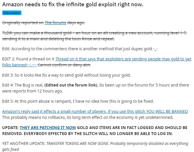 近日,《新世界》服务器转移后出现数据持久化问题,导致少数玩家出现“Character_persist_Failure”报错,而一些玩家发现处于这种情况下的角色可以通过“赠予金币”给另外一位玩家,然后立即退出游戏,从而达到金币数量翻倍的效果,因为如此操作后,赠予金币的一方不会失去金币而接受金币的一方还会收到金币。 一些发现该Bug的玩家开始利用该漏洞疯狂刷金币,此外,除了自刷金币,也有些卡Bug玩家会赠予其他玩家巨额金币,目前亚马逊官方已经注意到该Bug并表示恶意使用该Bug刷钱的玩家将会封禁,从昨日开始,已有大量玩家要求亚马逊官方关闭服务器因为该行为已经破坏好几个游戏服的经济,目前,游戏运营团队已经关闭人物赠予功能并将在问题修复后开放使用。 |